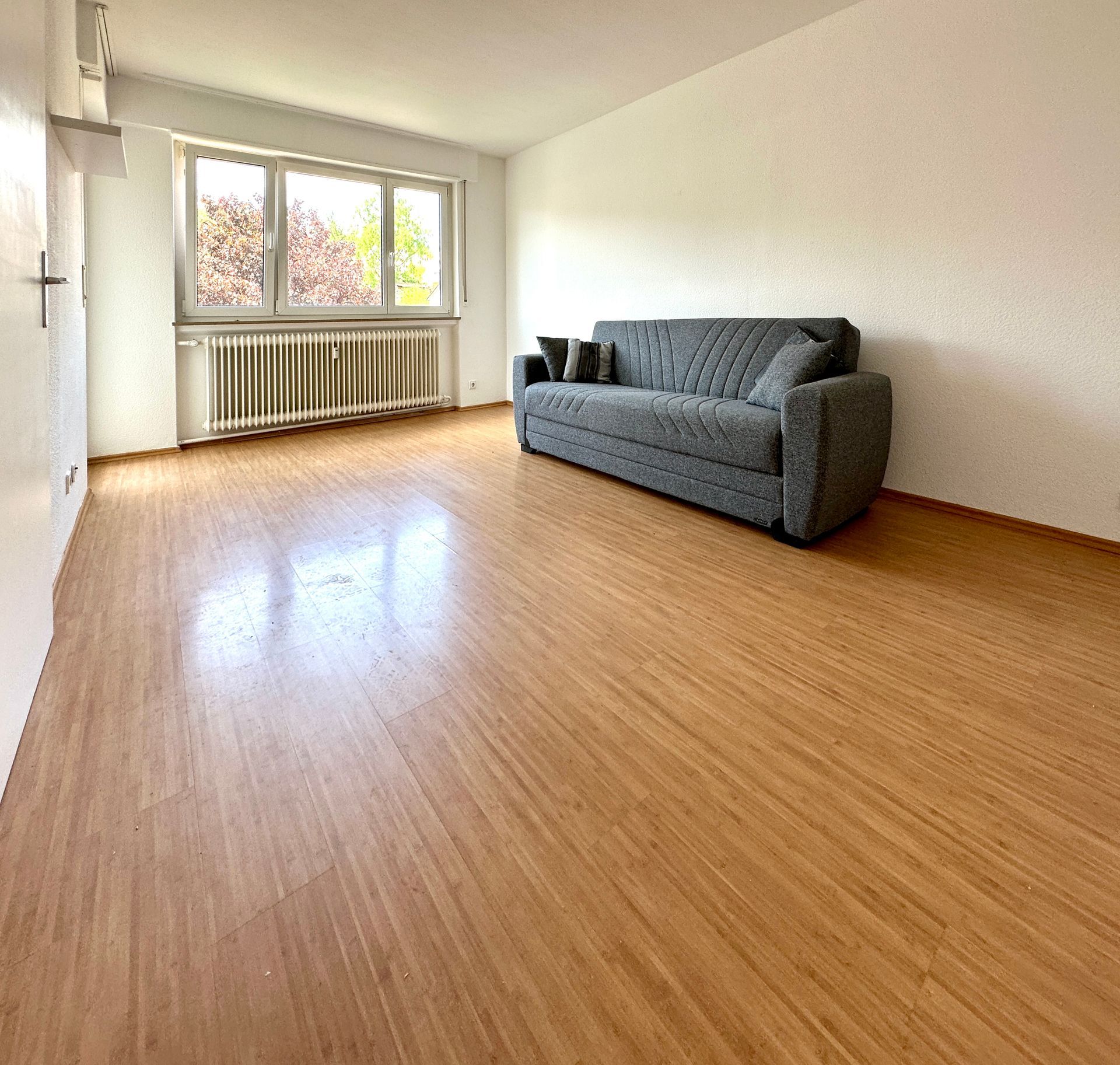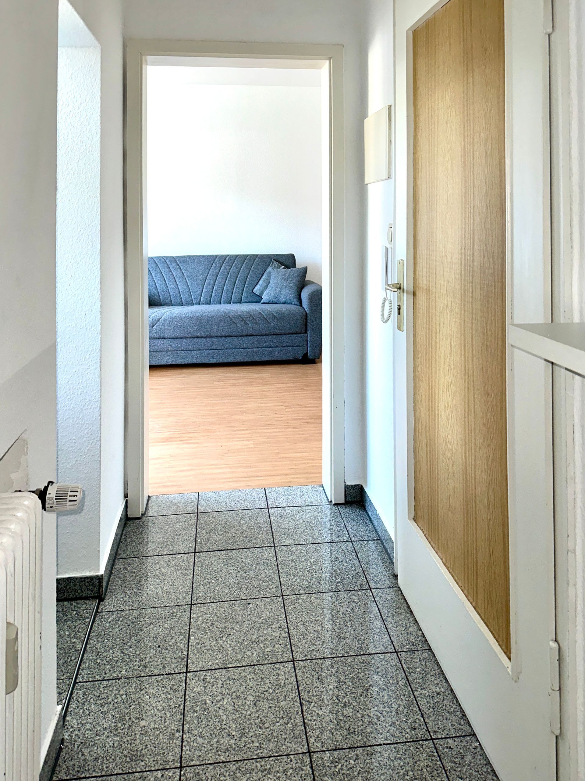 Die durchdachte Aufteilung der 28 m² Wohnfläche sorgt für abgeschlossene Räume und einen kleinen Flur, der diese miteinander verbindet. Große Fenster durchfluten die gesamte Wohnung mit viel Tageslicht und eröffnen einen schönen Blick auf den grünen Vorplatz des Hauses.