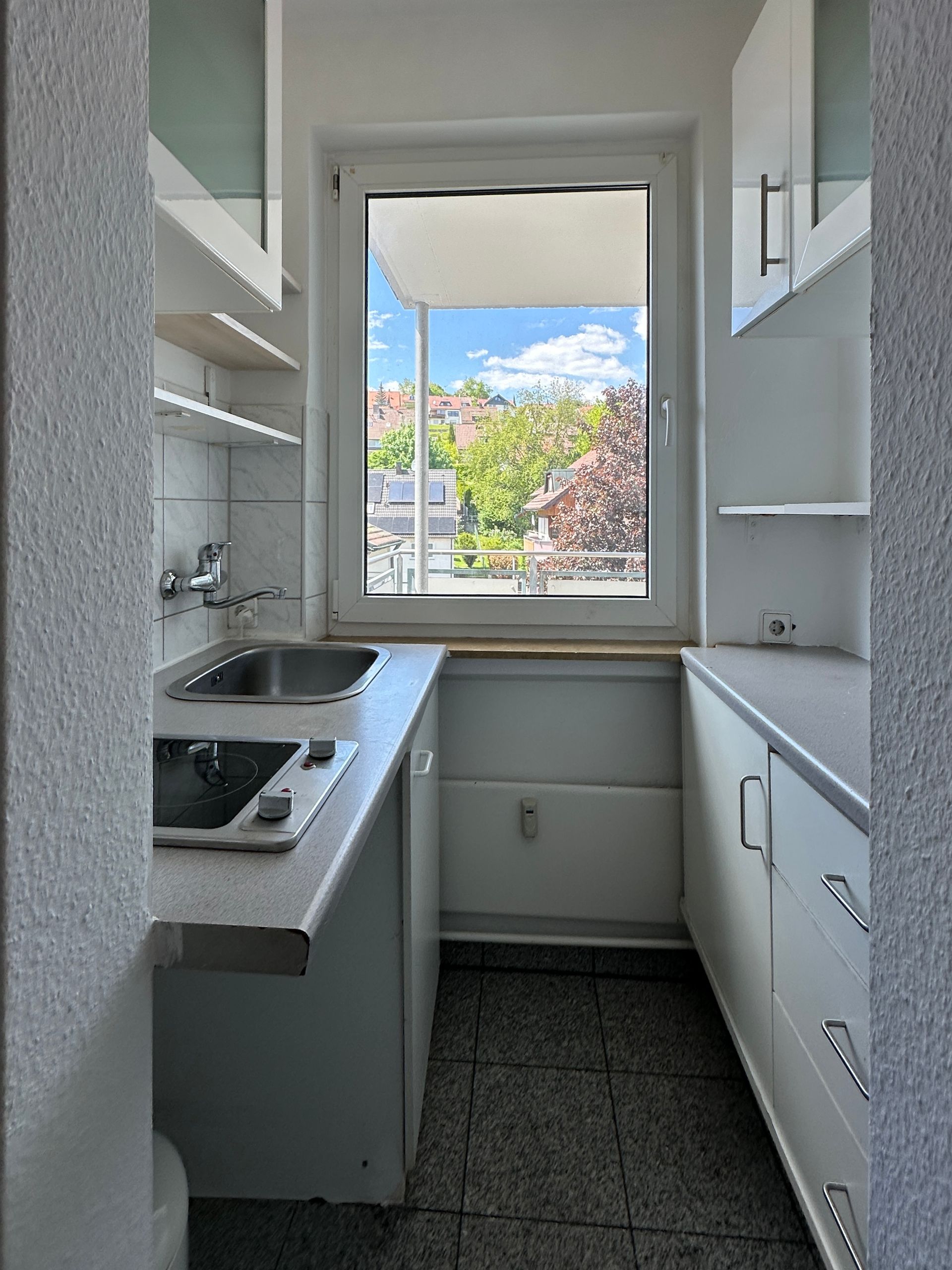 Zum Wohnen und Schlafen steht ein großzügiges Zimmer mit ausreichend Platz für ein Sofa, eine Essecke und einen gemütlichen Schlafbereich zur Verfügung. Angrenzend an das Wohn-/Schlafzimmer befindet sich ein überdachter Balkon, der für einen erholsamen Feierabend in der Sonne sorgt. Die Küche ist mit Einbaumöbeln, einem Spülbecken und einem Ceran-Doppelkochfeld ausgestattet und im Flur befindet sich ein großer Einbauschrank für die Garderobe.