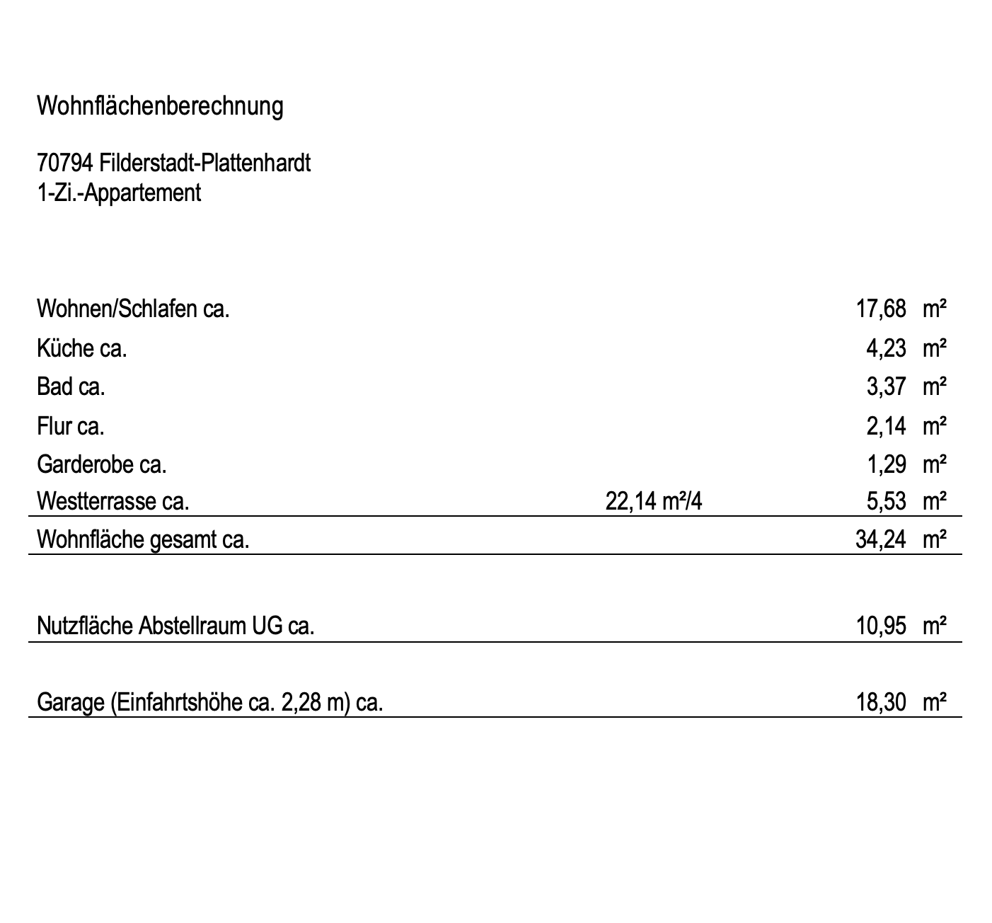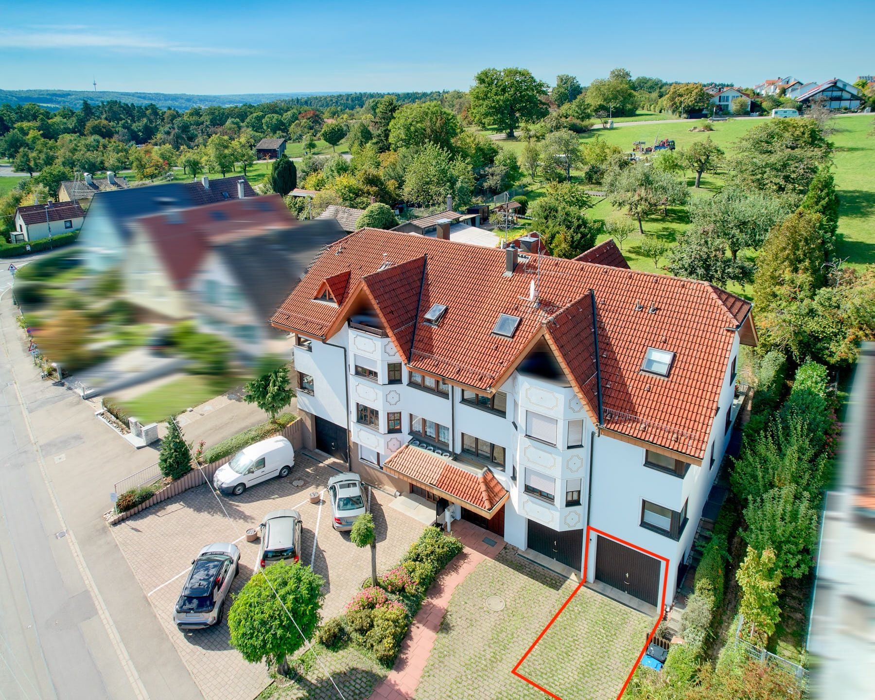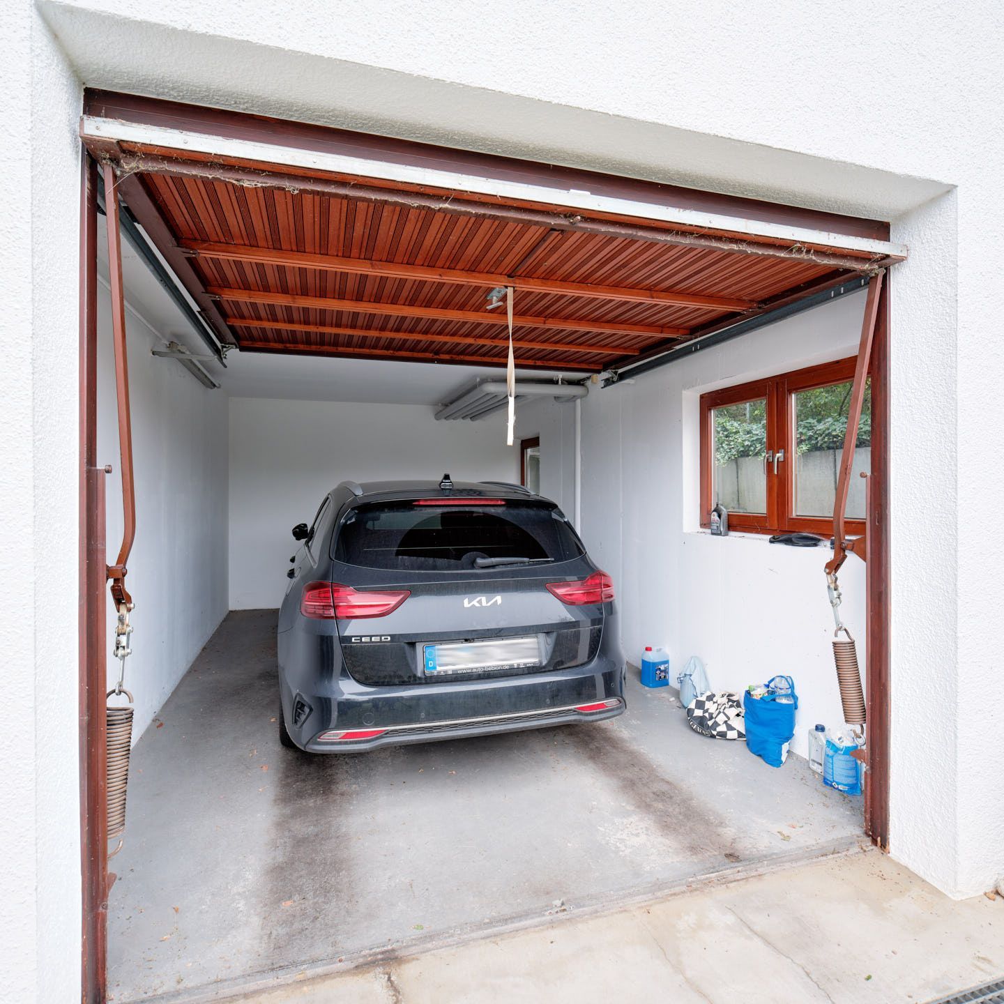 Zur Wohnung gehören des Weiteren ein großer Abstellraum (ca. 10,95 m²) im UG, eine geräumige Einzelgarage mit ca. 18,3 m² (L x B / 5,35 m x 3,42 m), in der auch Fahrzeuge mit einer Höhe bis ca. 2,25 m Platz finden und ein Außenstellplatz vor der Garage.