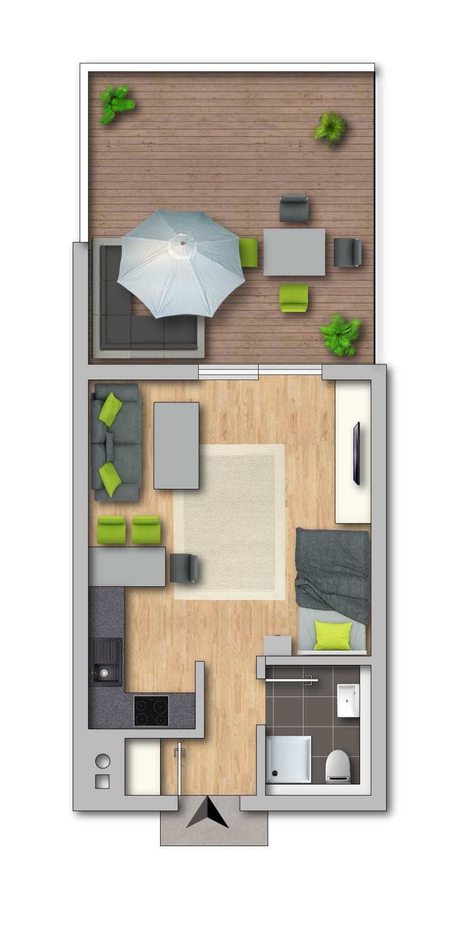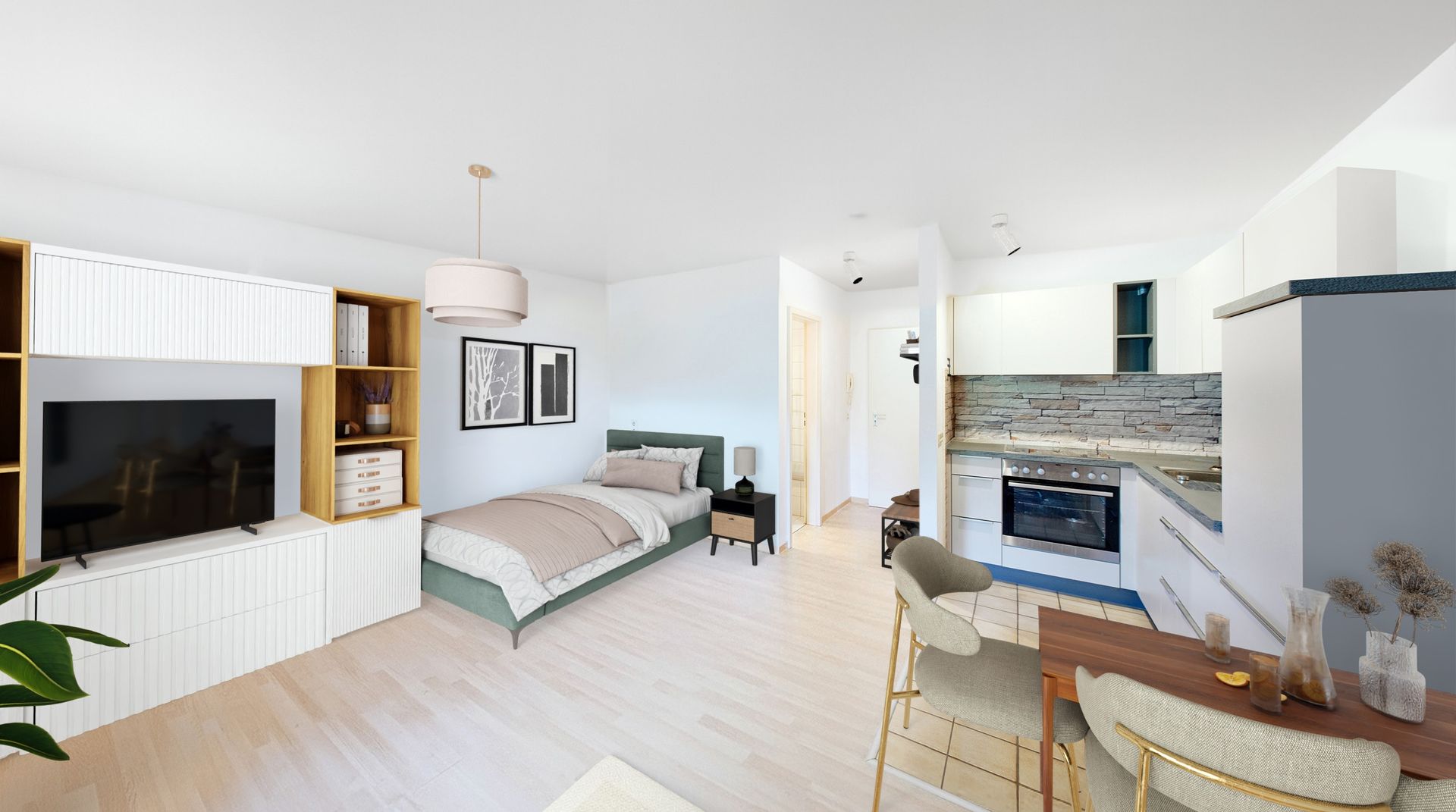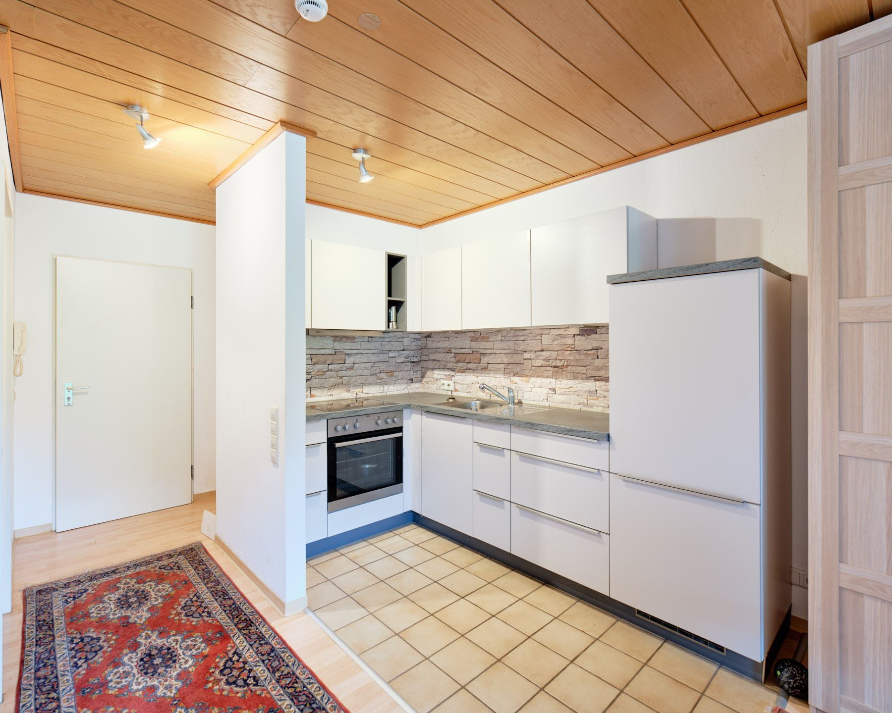 Die Küche wurde in den Wohn-/Schlafraum integriert und mit einer modernen, geschmackvollen EBK ausgestattet. Für die Garderobe ist neben dem Wohnungseingang im Flurbereich eine praktische Nische vorhanden. Das Duschbad beinhaltet eine Dusche, ein WC und ein Waschbecken.