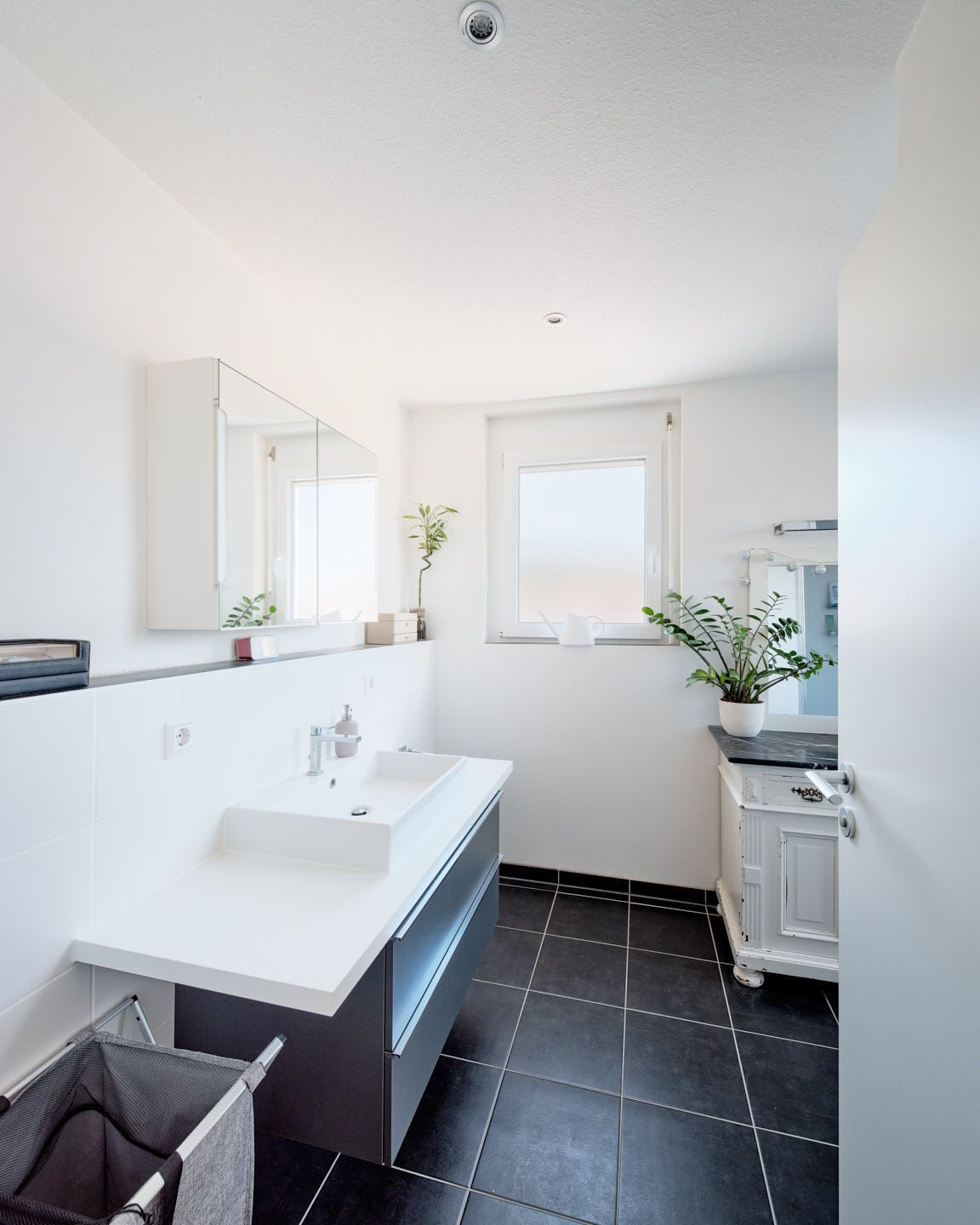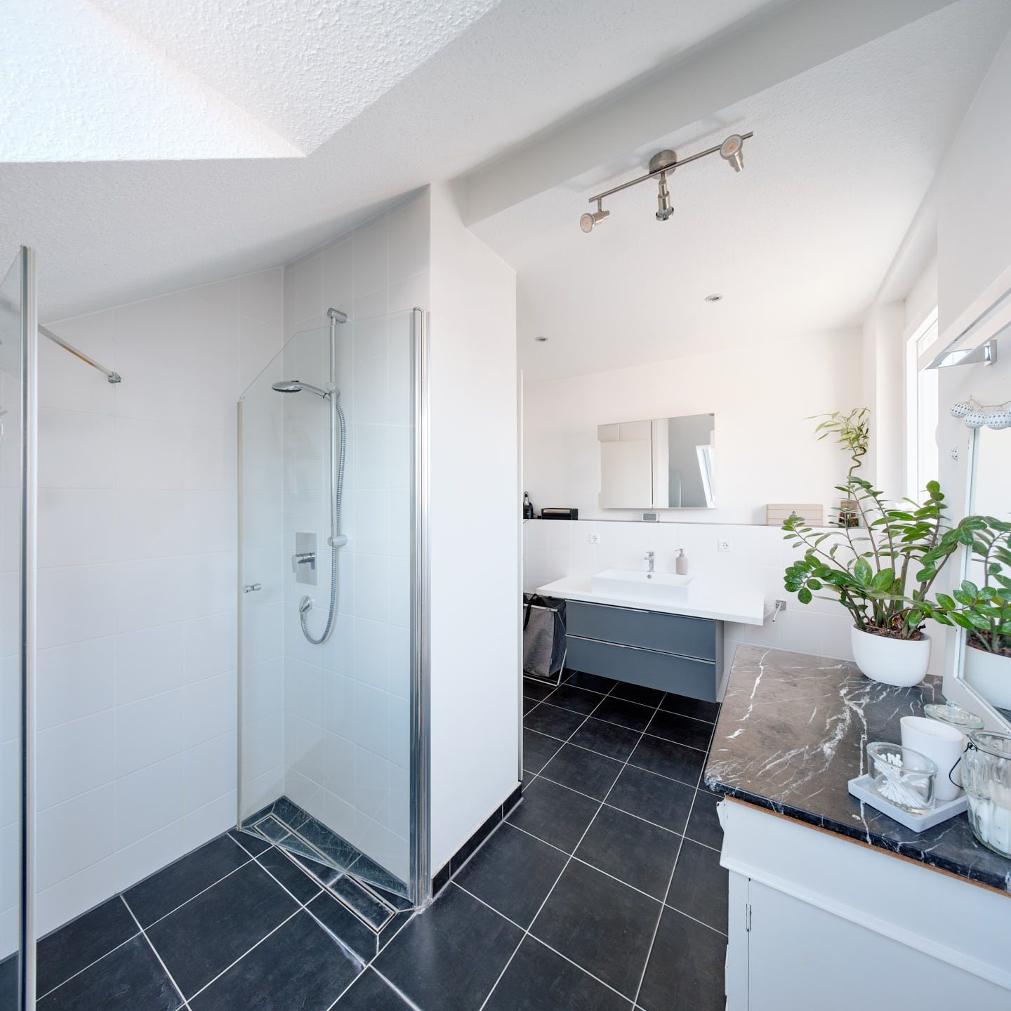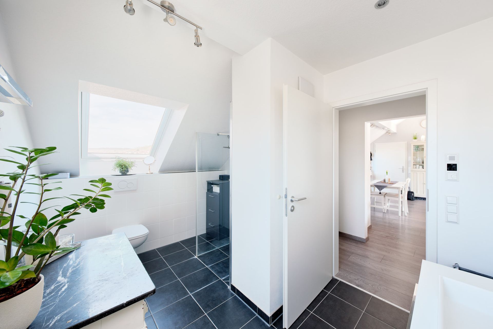 Durch einen kleinen Flur wurde für mehr Privatsphäre das Schlafzimmer, das geräumige Tageslicht-Duschbad mit bodengleicher Dusche und das Gäste-WC vom offenen Wohnbereich abgetrennt.