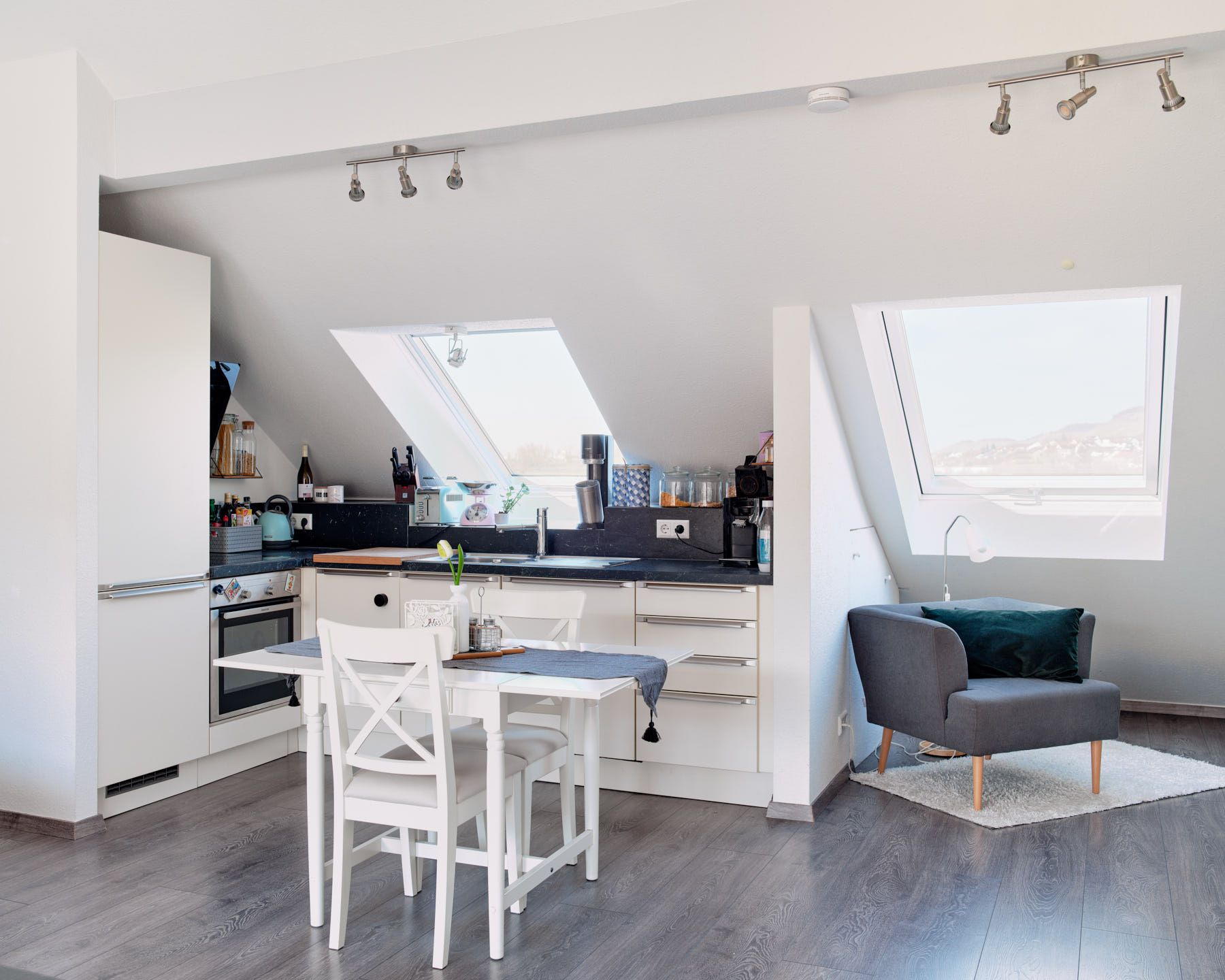 Mittelpunkt der Wohnung ist der große bis in den First geöffnete Wohn-/Ess-/Kochbereich. Die hohe Decke verleiht diesem Raum Weite und eine luftige Atmosphäre.