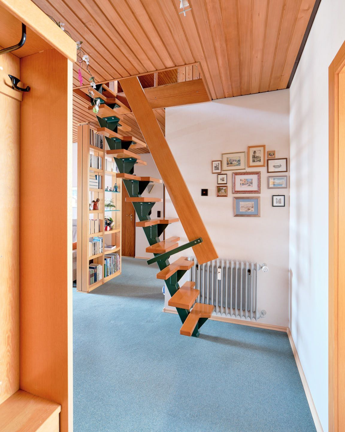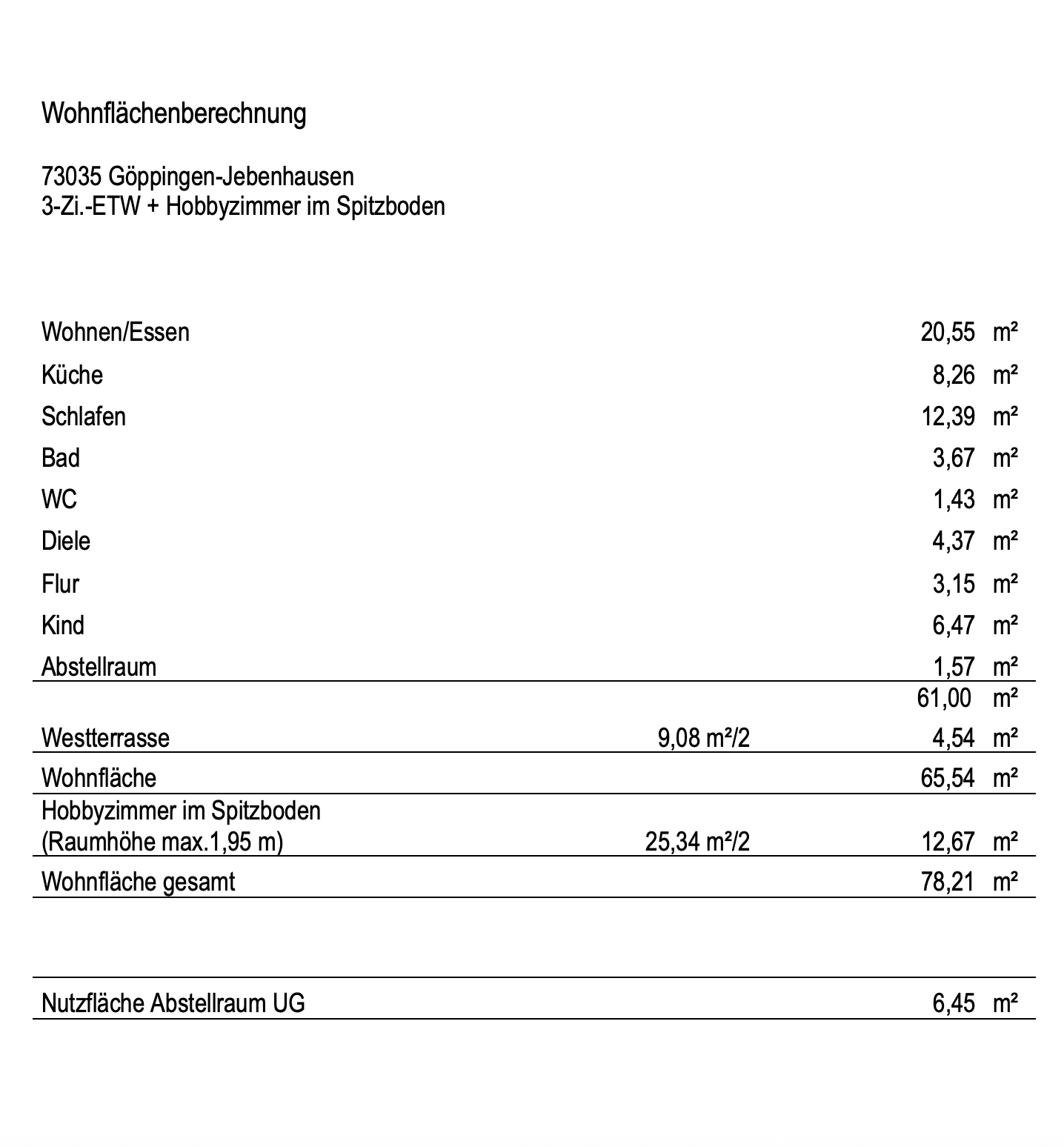 Neben dem Kellerraum im UG stehen zusätzliche Stauflächen innerhalb der Wohnung im Kniestock des Kinderzimmers und im Abstellraum auf der Terrasse zur Verfügung.