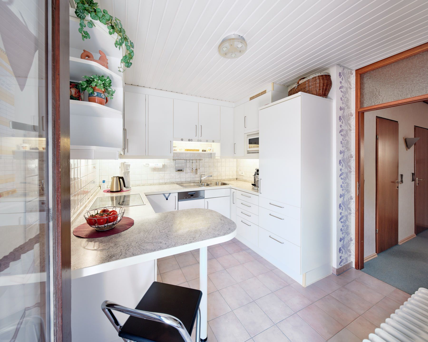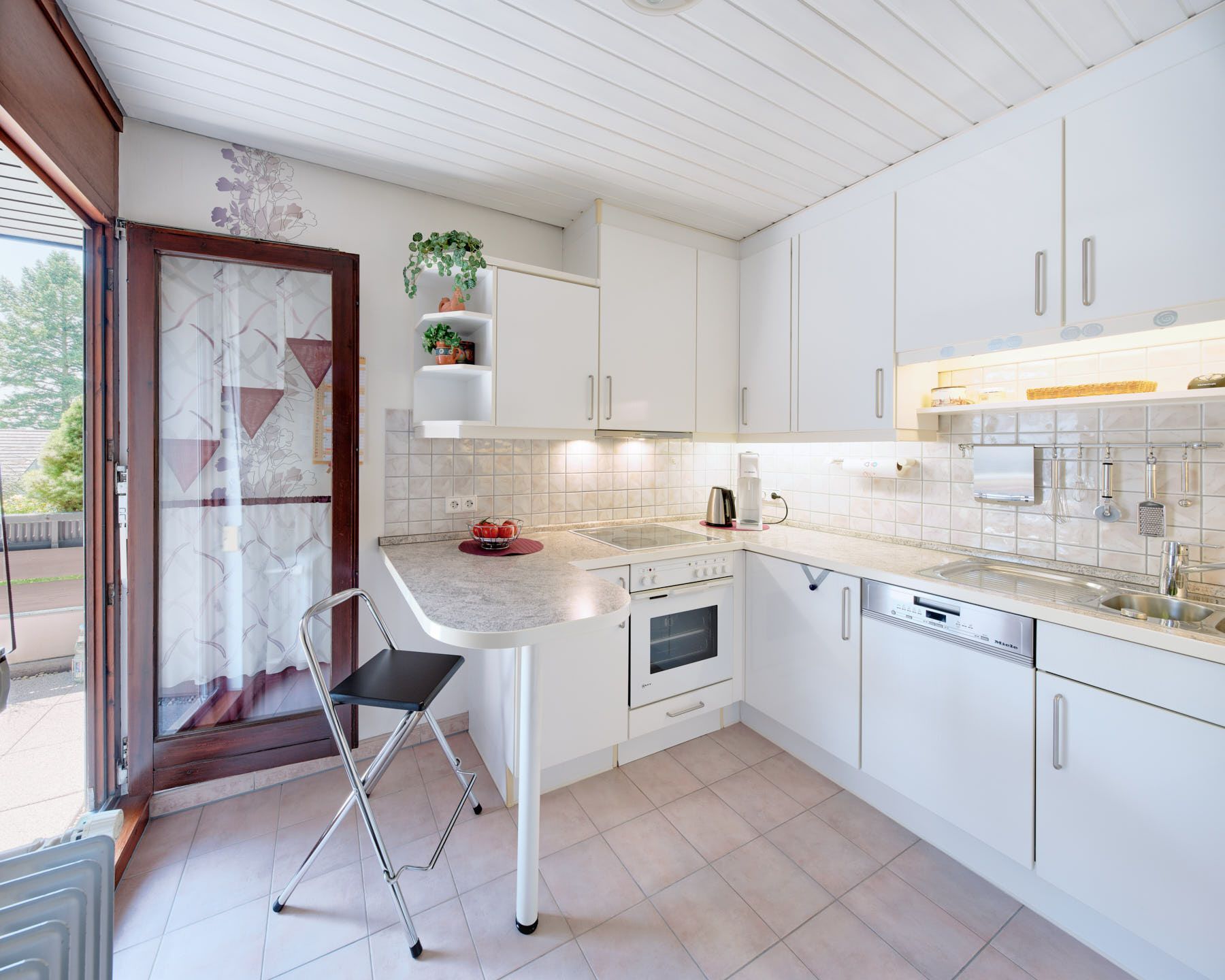Die Küche ist mit einer zeitlosen und praktischen EBK ausgestattet und bietet auch einen kleinen Essplatz für die Mahlzeiten zu zweit.