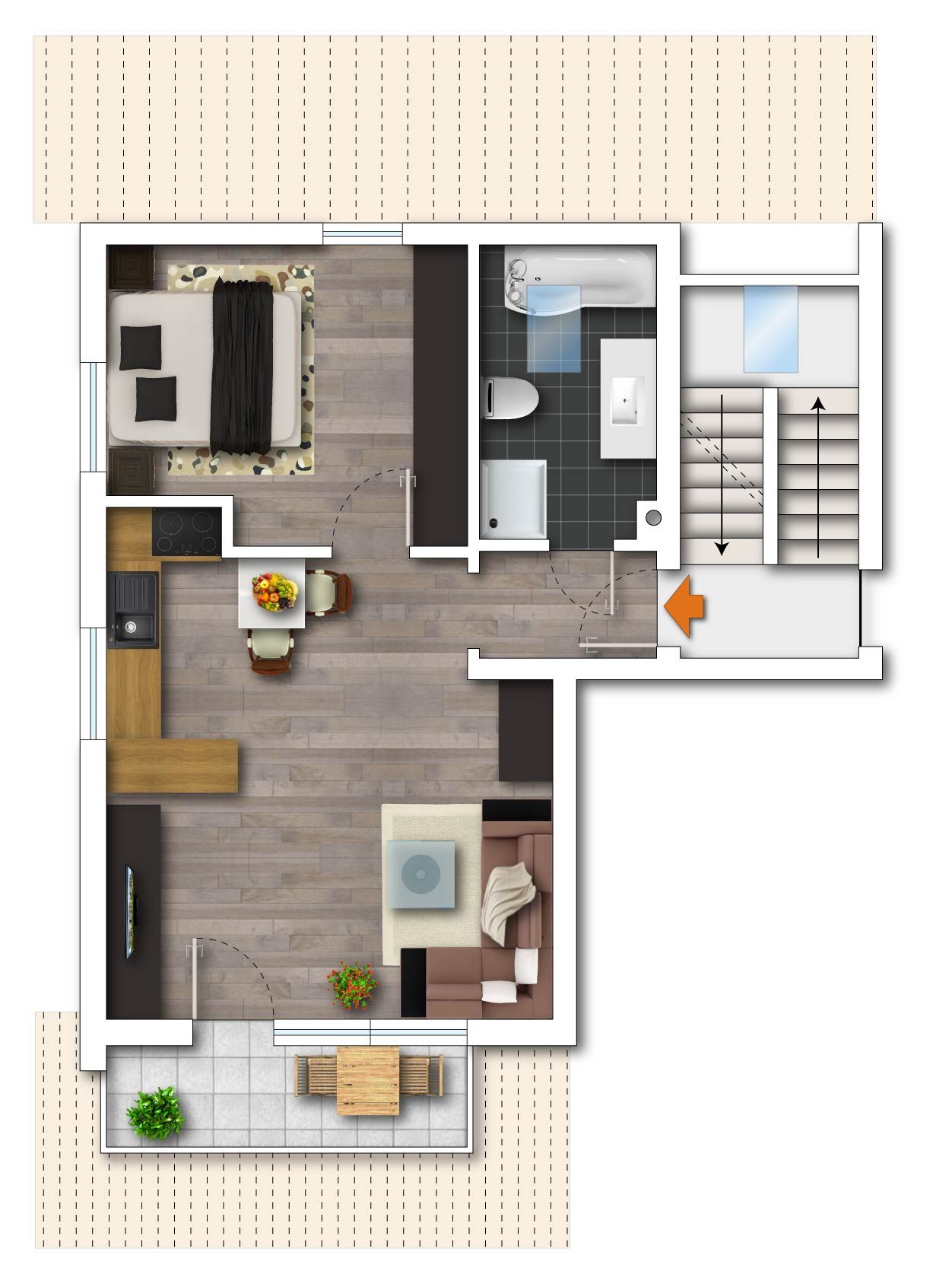 Ein weiteres Highlight ist das hochwertig ausgestattete Tageslicht-Bad. Geschmackvolle Materialien und das Vorhandensein von Badewanne und Dusche schaffen eine Wohlfühlatmosphäre.