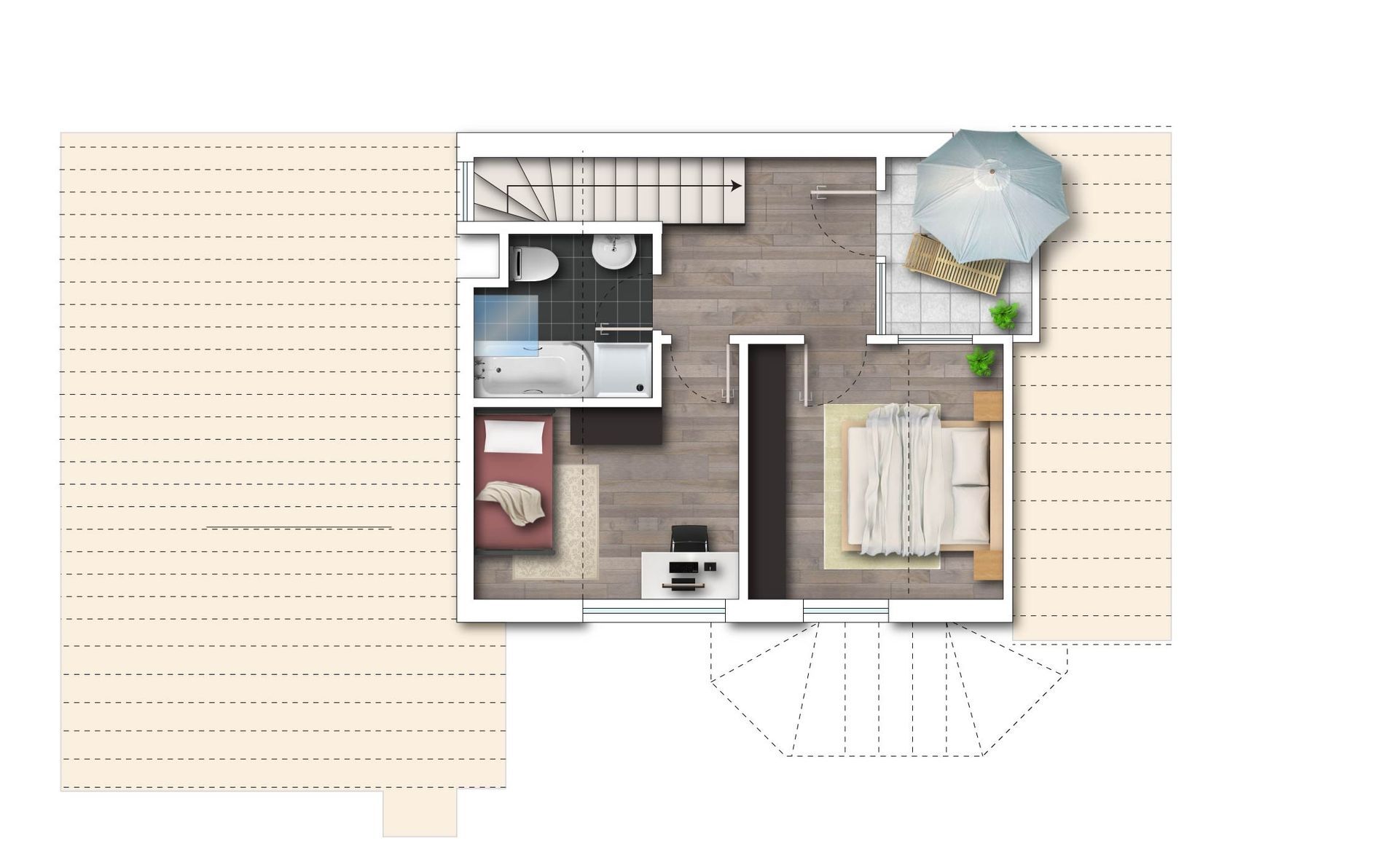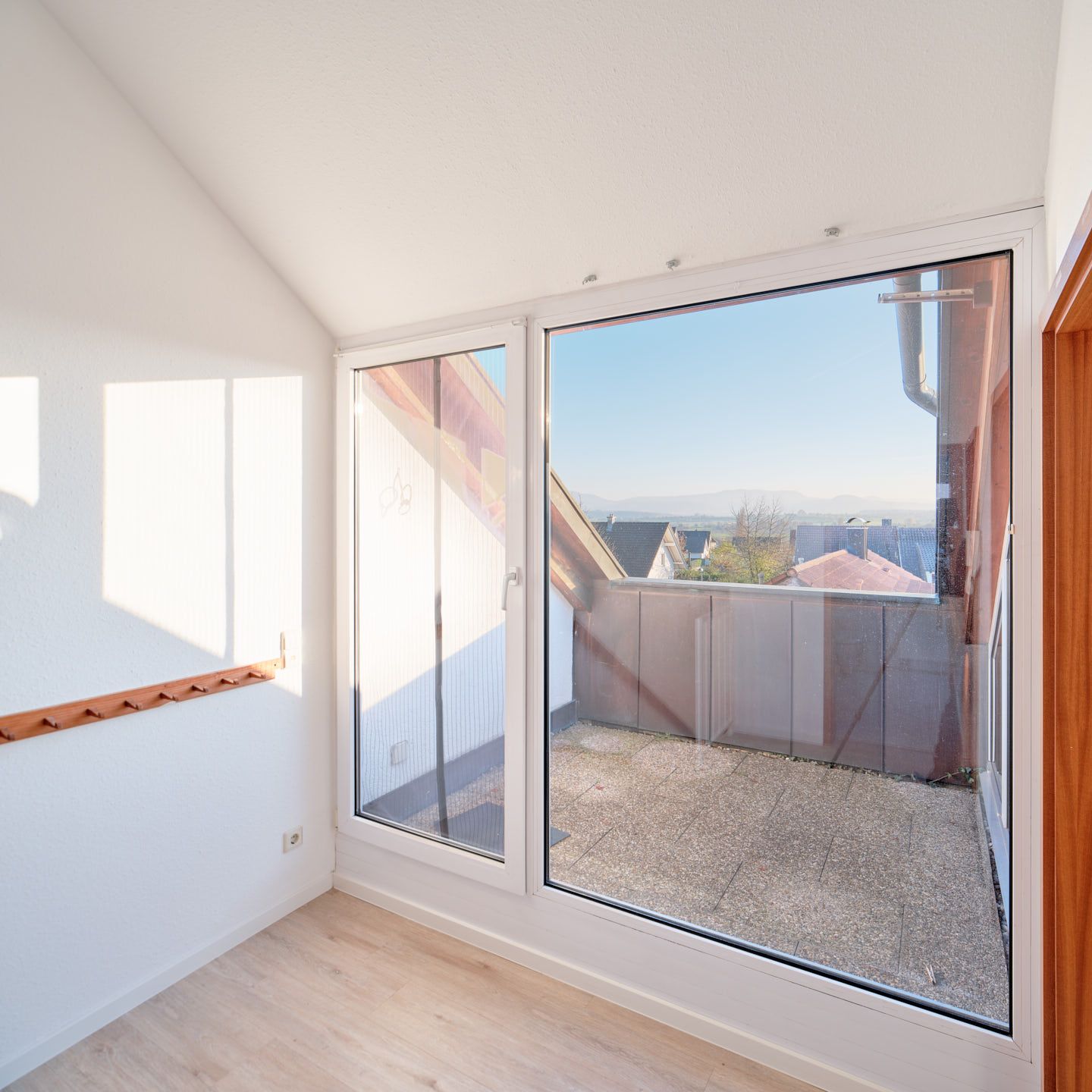 Auf der 2. Ebene erstrecken sich das Schlafzimmer, ein weiteres Kinderzimmer oder Büro, ein Tageslichtbadezimmer mit Badewanne, Dusche, Waschbecken und WC sowie eine Süd-Loggia mit einem sehr schönen Fernblick – ein idealer Ort zum Entspannen.