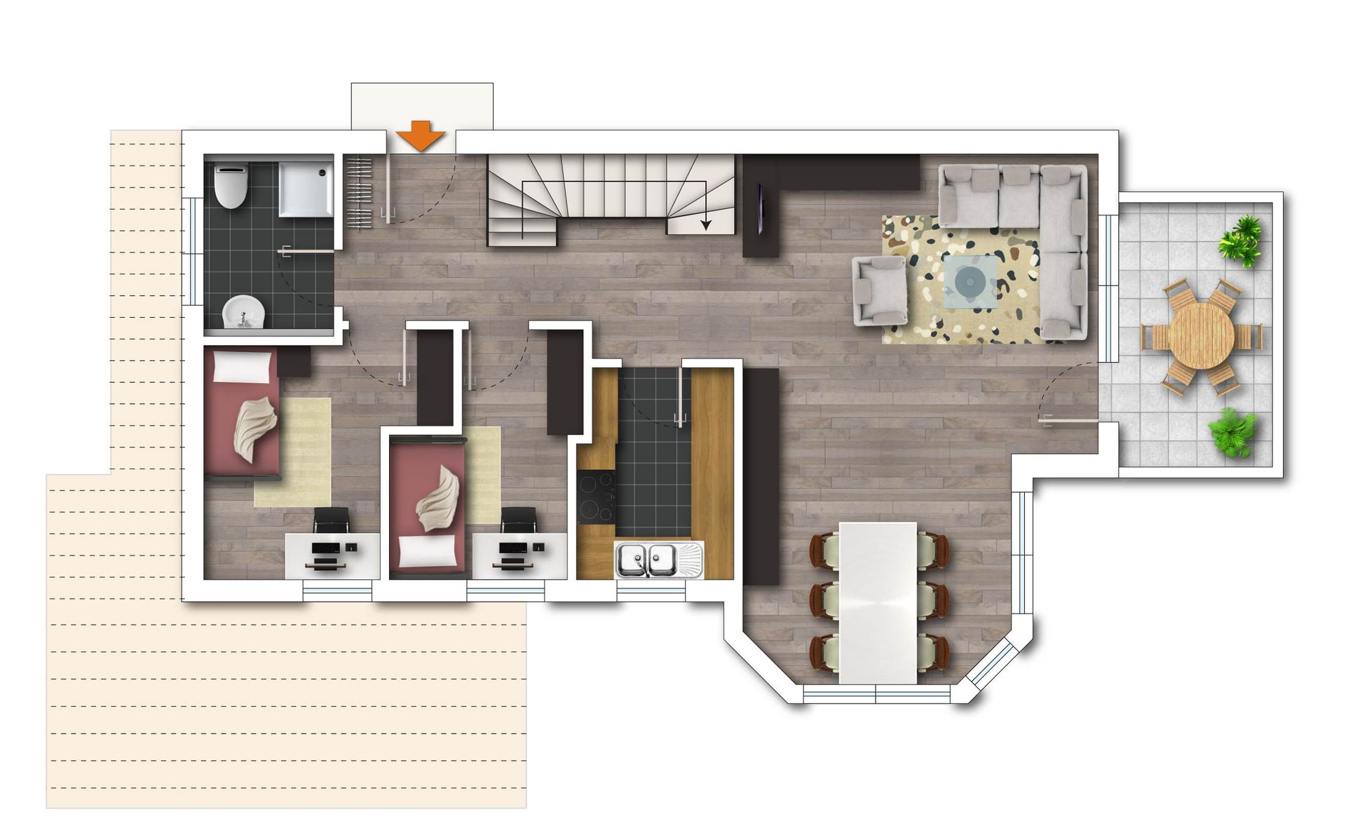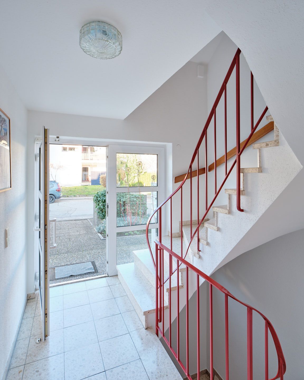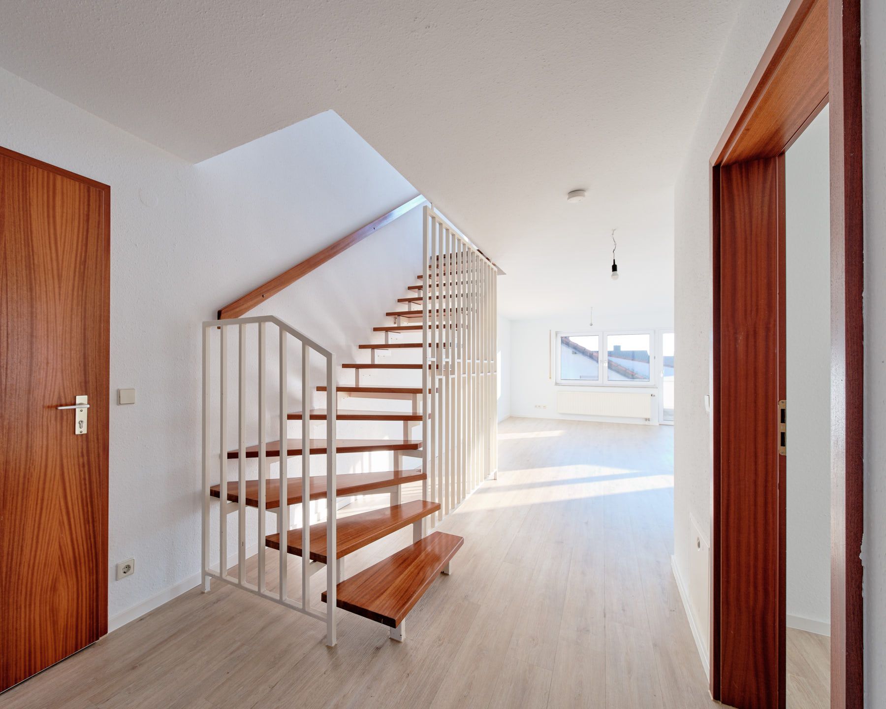 Eine komfortable Treppe, die den Eingangsbereich optisch vom Wohnbereich trennt, führt bequem in die 2. Wohnebene.