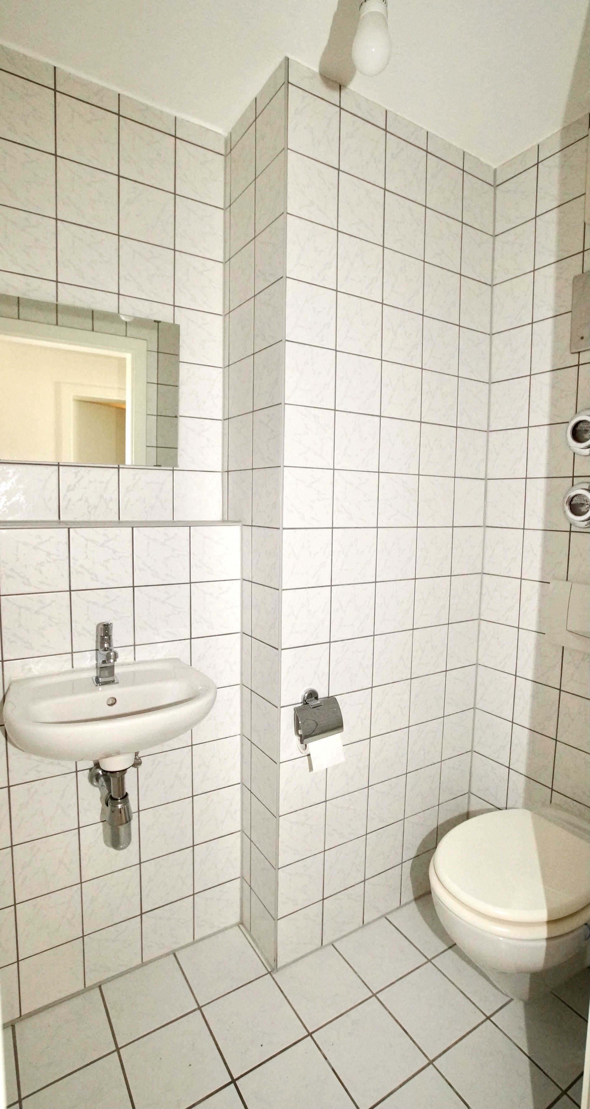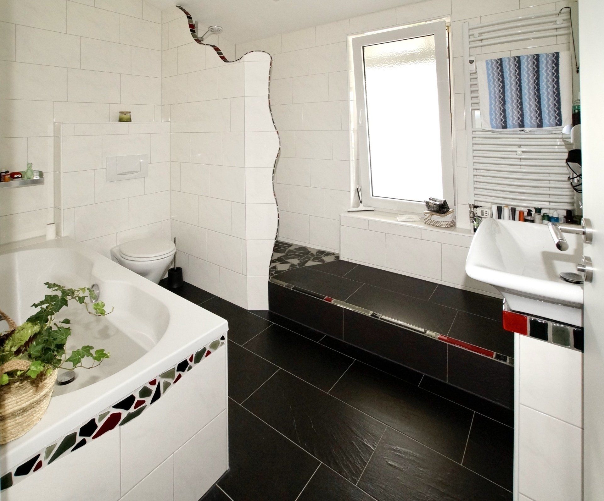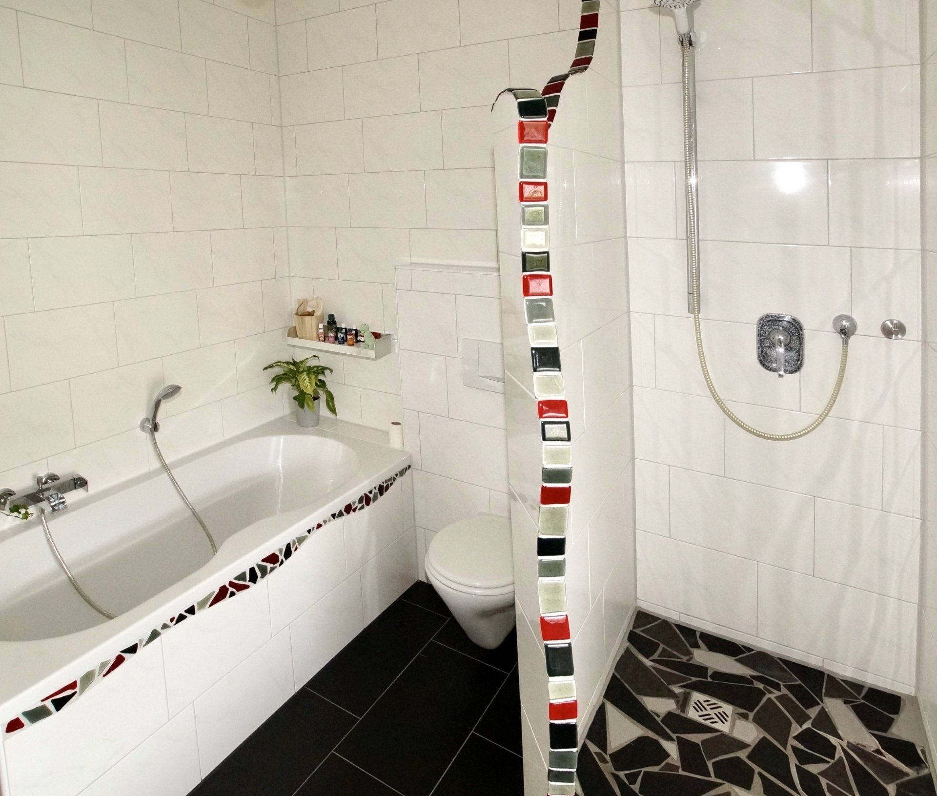 Im Badezimmer befinden sich eine Badewanne, ein Waschbecken, ein WC, ein Handtuchheizkörper und eine Dusche. Individuell, geschmackvoll wurde in weiß gefliest und mit dezent farbigen Akzenten Blickfänge gesetzt.