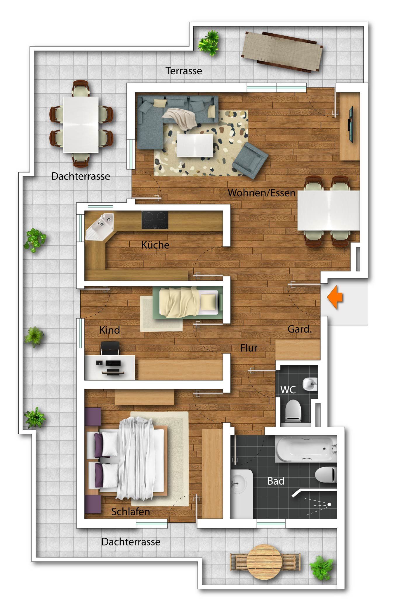 Trotz riesiger Terrasse kommen die drei Zimmer, Küche, Bad und Gäste-WC bzgl. der Wohnfläche nicht zu kurz. Der großzügige Wohn-/Essbereich hält reichlich Platz auch zum Feiern im größeren Kreis bereit und verfügt über zwei Terrassenausgänge. Ebenfalls sind das Schlaf- und Kinderzimmer geräumig, haben genügend Stellfläche für Schränke und je einen Terrassenzugang.