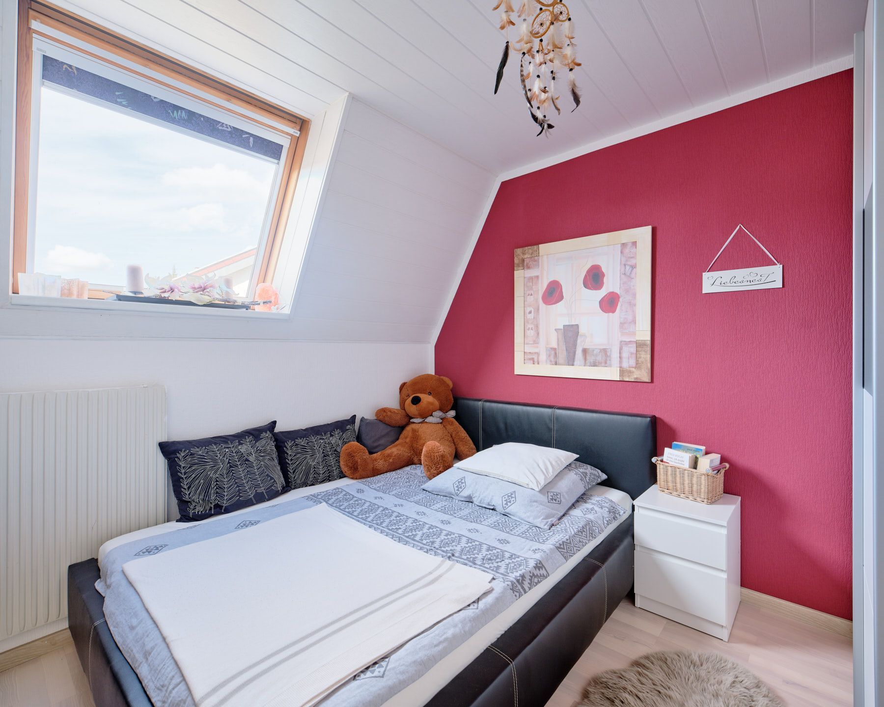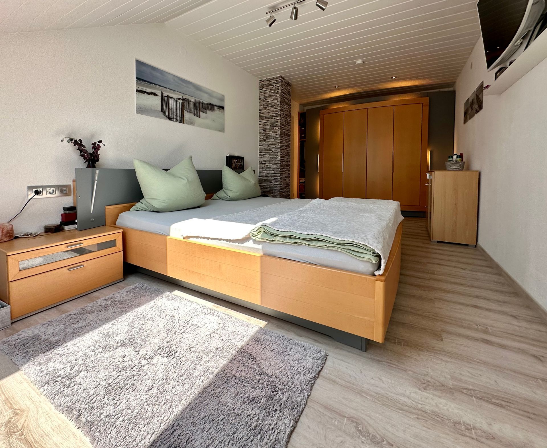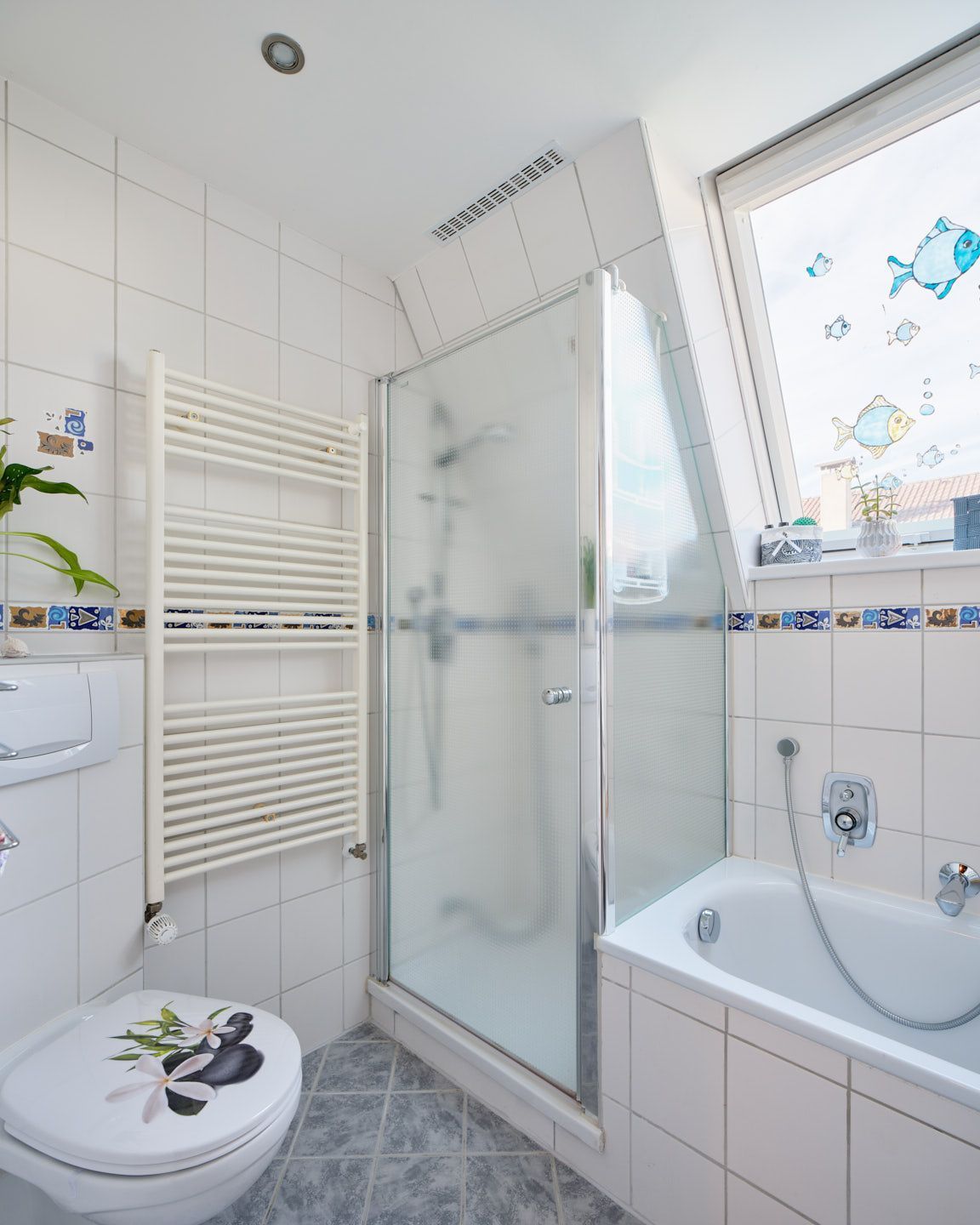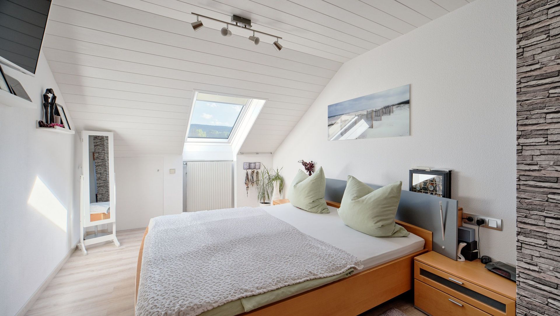 Im DG befinden sich 2 helle Zimmer, das Tageslicht-Badezimmer mit Badewanne, Dusche, Handtuchheizkörper, WC und Waschbecken sowie ein komfortabel dimensioniertes Schlafzimmer, in dem ein Kingsize-Bett und große Kleiderschränke Platz finden.
