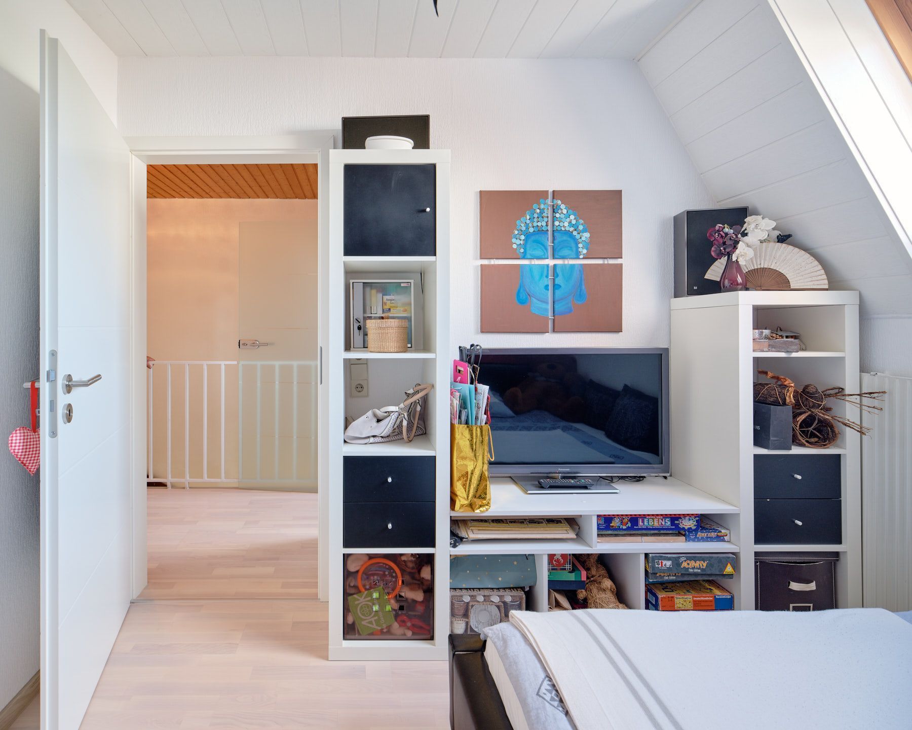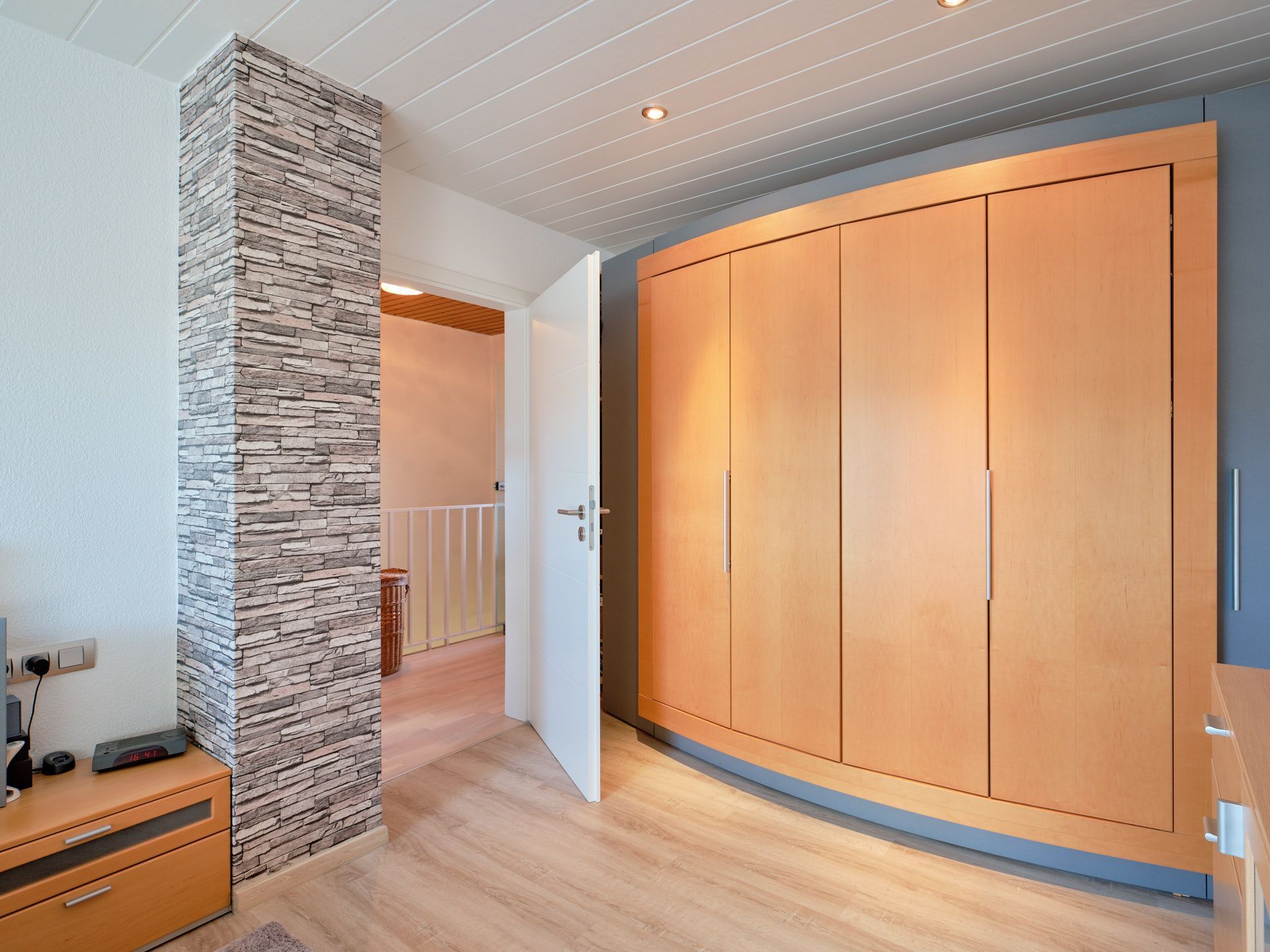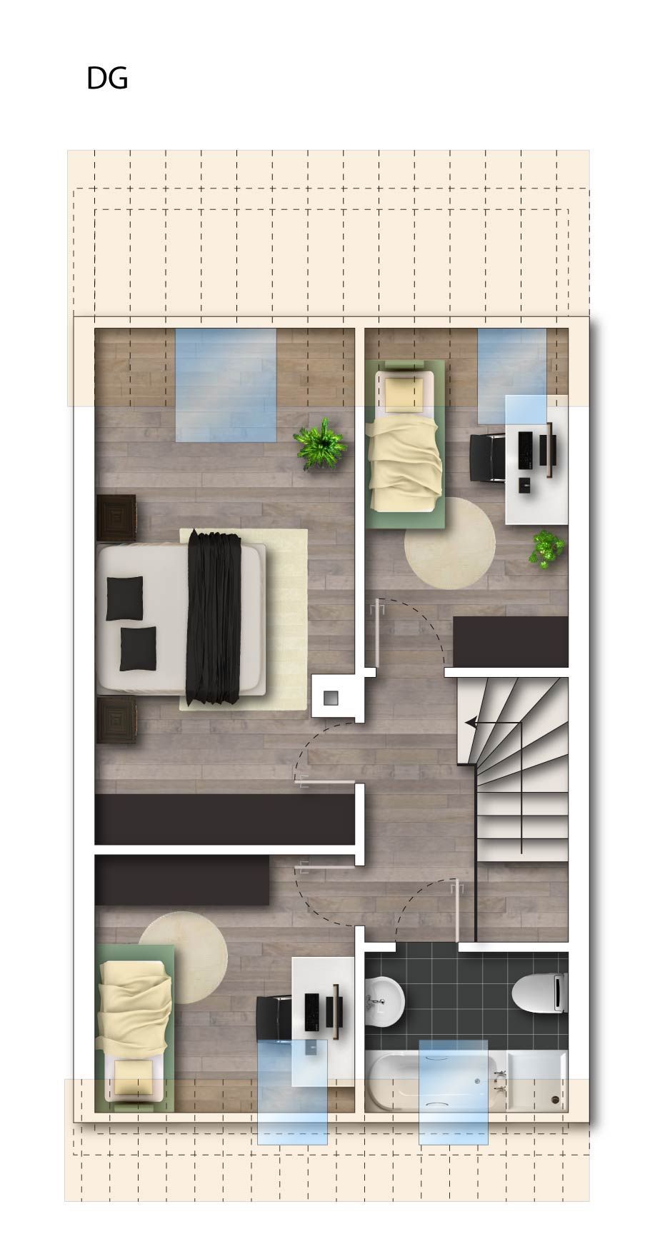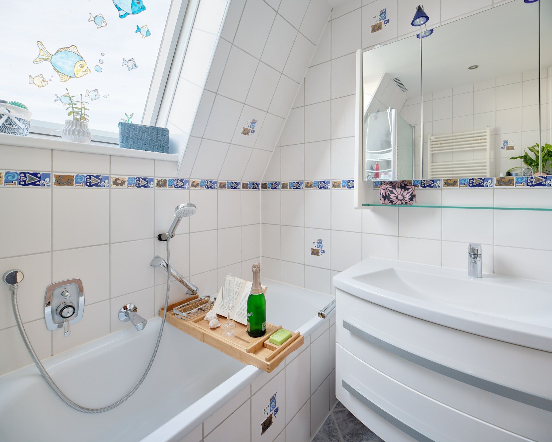 Im DG befinden sich 2 helle Zimmer, das Tageslicht-Badezimmer mit Badewanne, Dusche, Handtuchheizkörper, WC und Waschbecken sowie ein komfortabel dimensioniertes Schlafzimmer, in dem ein Kingsize-Bett und große Kleiderschränke Platz finden.