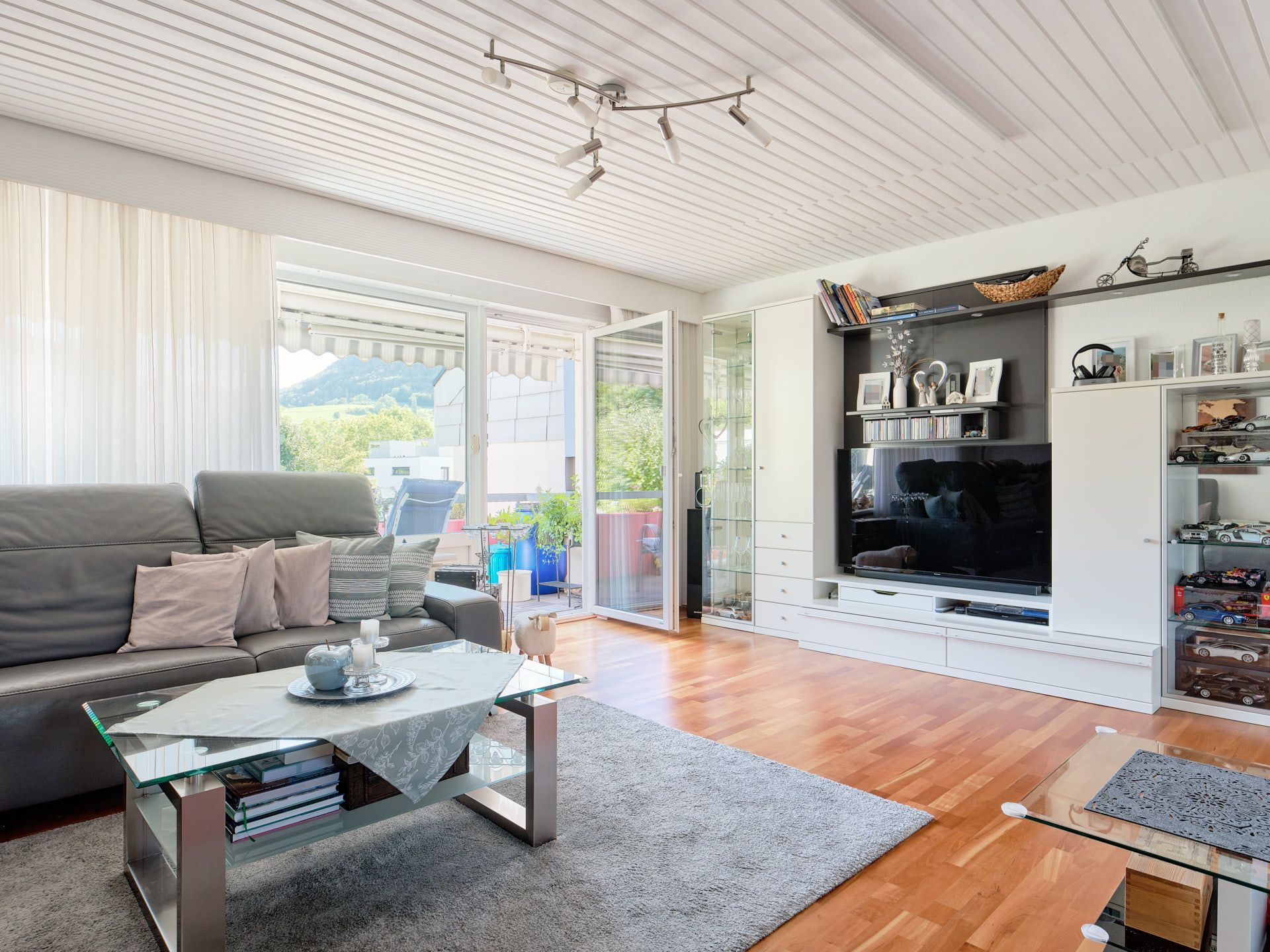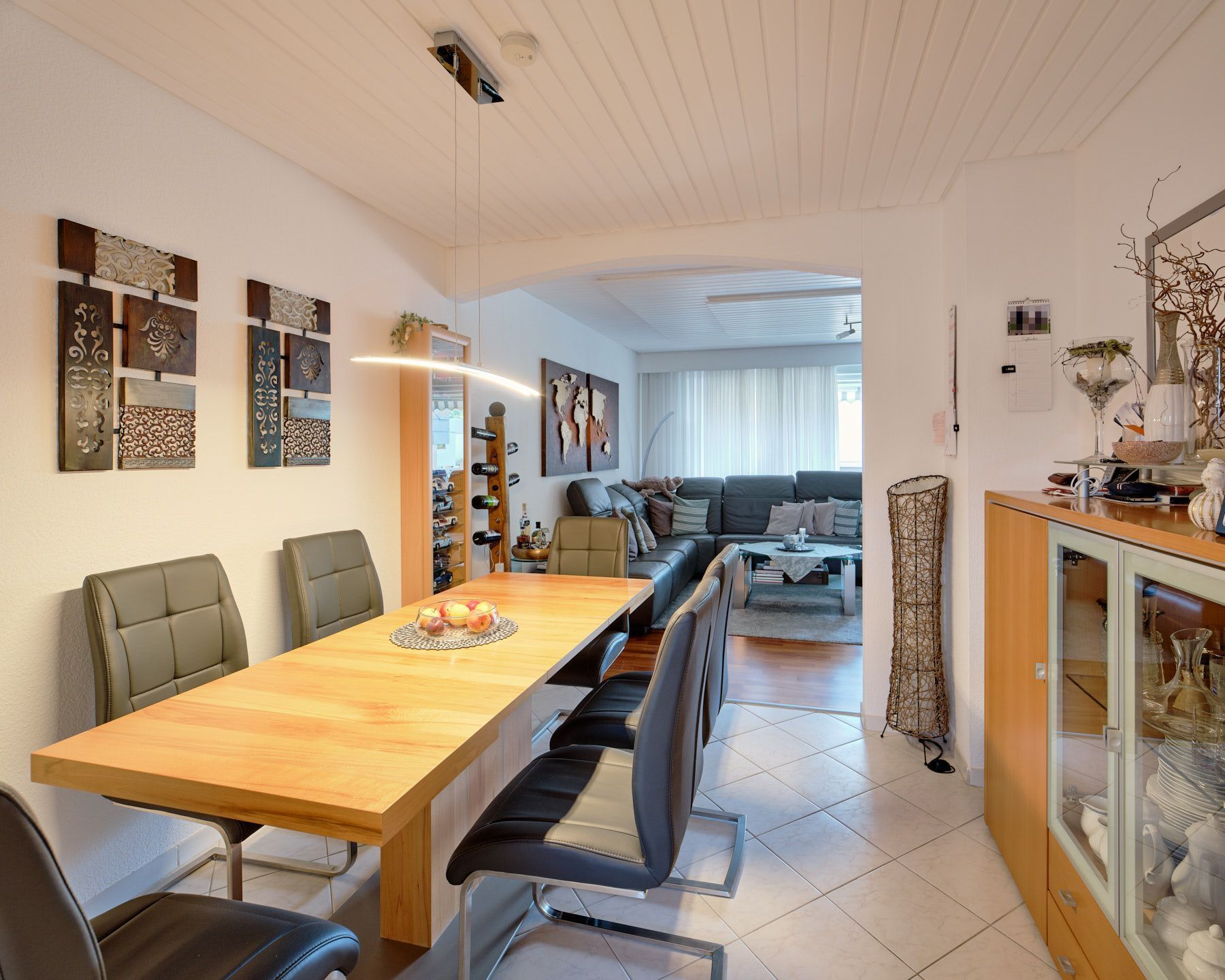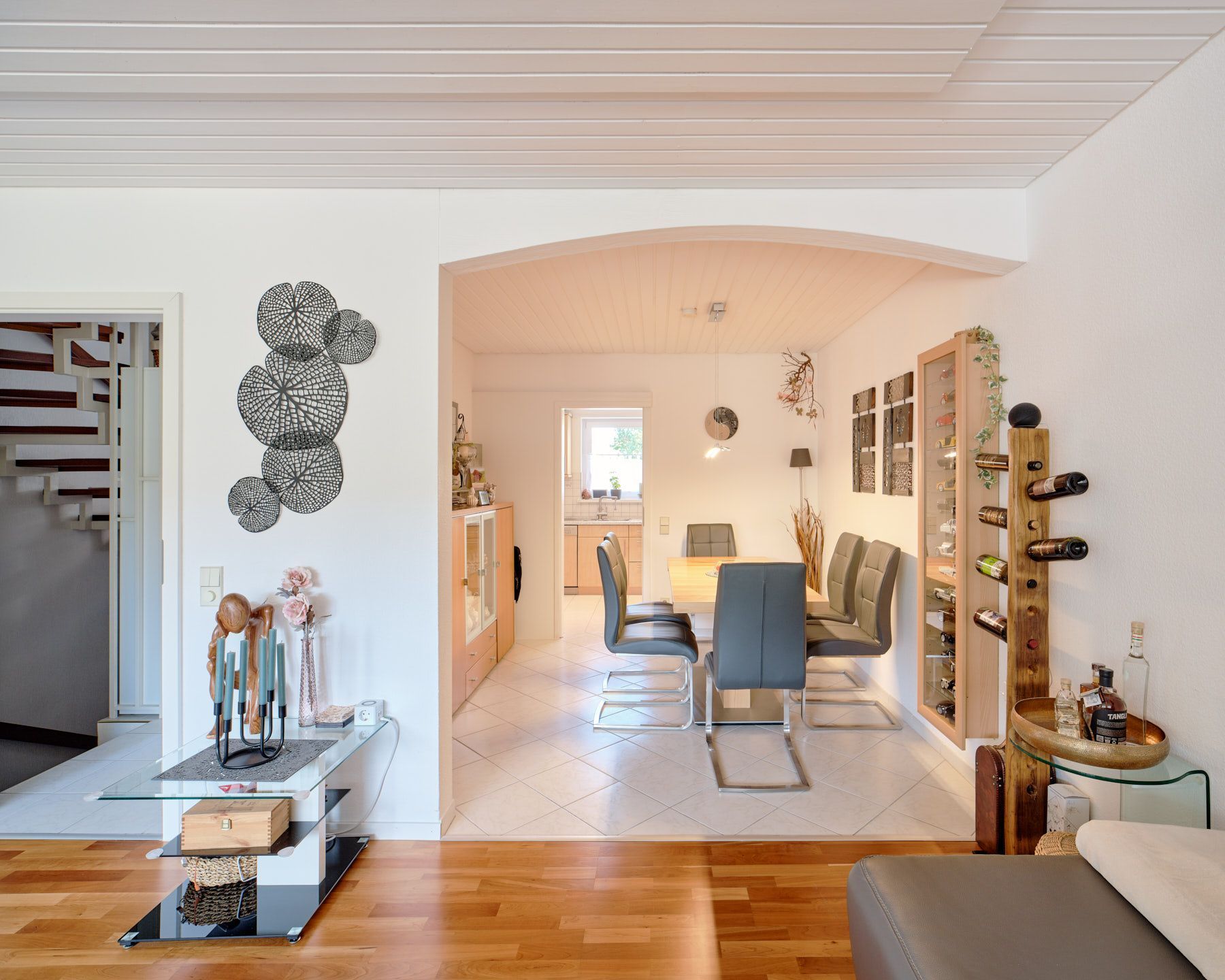 Der Hauptwohnbereich im EG besticht durch seine offene Gestaltung. Hier befindet sich ein geräumiges Wohnzimmer, das harmonisch mit dem Essbereich verbunden ist. Die Küche ist mit einer zeitlosen EBK ausgestattet und stellt viel Arbeitsfläche und Stauraum für ein entspanntes Kochen zur Verfügung.