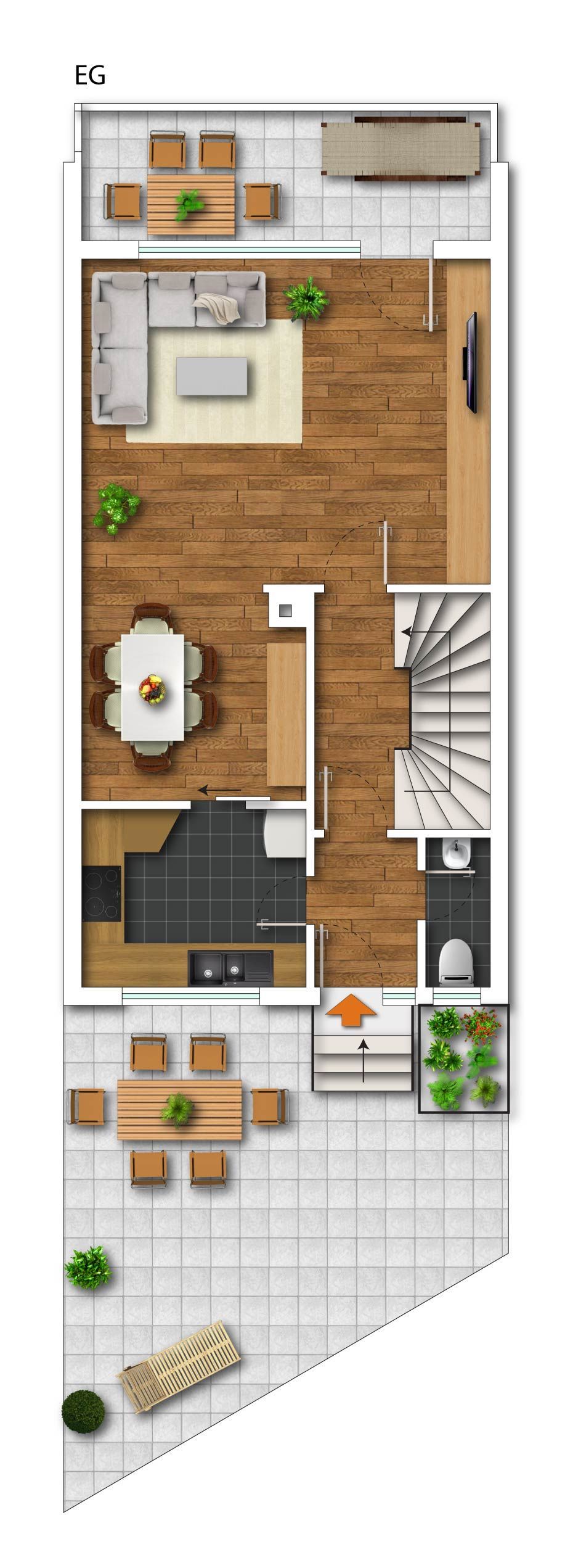 Der gelungene Grundriss bietet auf 3 Etagen ca. 107,49 m² Wohnfläche und den Bewohnern genügend Rückzugsmöglichkeiten im Innen- sowie Außenbereich. Große Fenster im ganzen Haus sorgen für viel Tageslicht und schaffen eine angenehme Wohnatmosphäre.