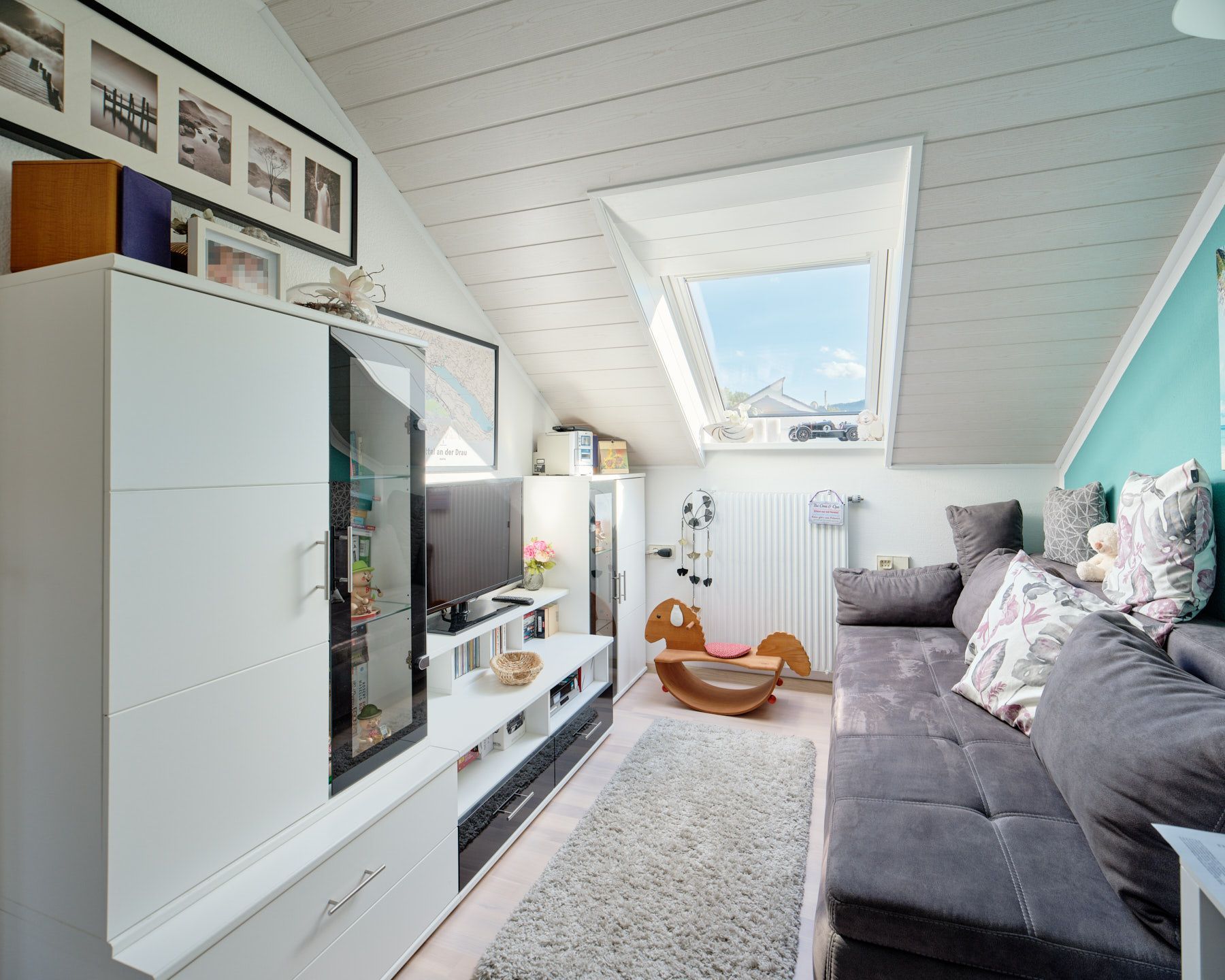Weiteres Potential bietet der Spitzboden, der vom DG-Flur über eine Auszugstreppe erreichbar ist. Dieser könnte ausgebaut und als Büro oder Spielzimmer genutzt werden. Zwei große neuwertige Dachflächenfenster, die diesen Raum mit viel Licht versorgen, sind bereits eingebaut.