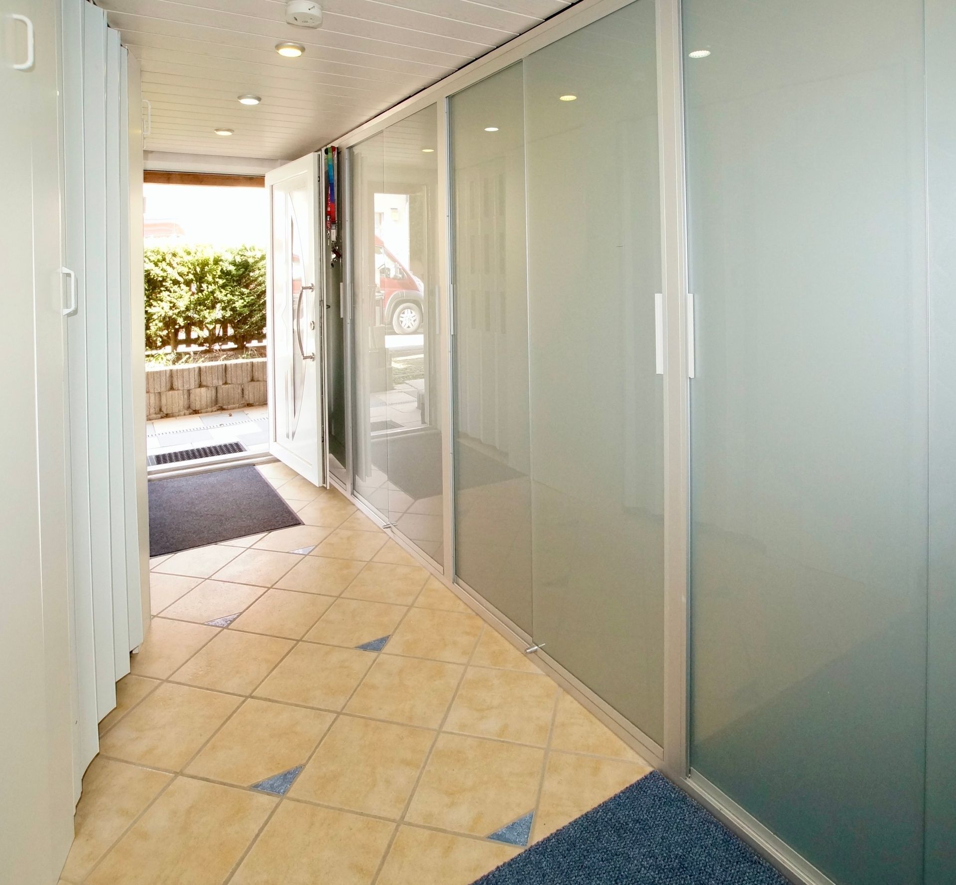 Der Eingangsbereich ist geschmackvoll auf der linken Flurseite mit schicken Glaseinbauschränken ausgestattet, die zusätzlichen Stauraum bereitstellen und für ein modernes Ambiente sorgen. Auf der rechten Flurseite befindet sich die Haustechnik und ein Spülbecken. Ebenfalls praktisch und schön mit weißen Elementen verblendet.