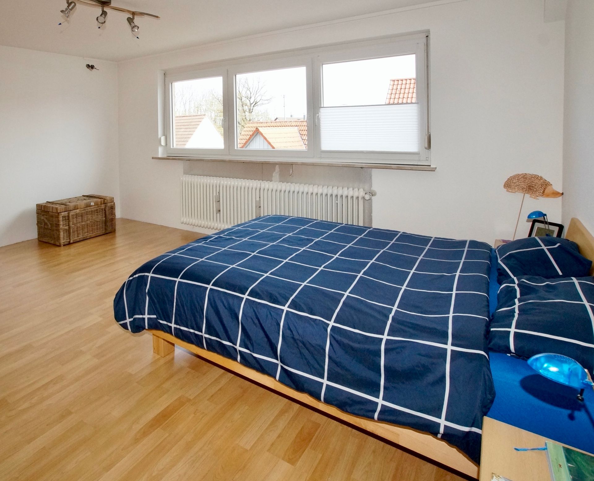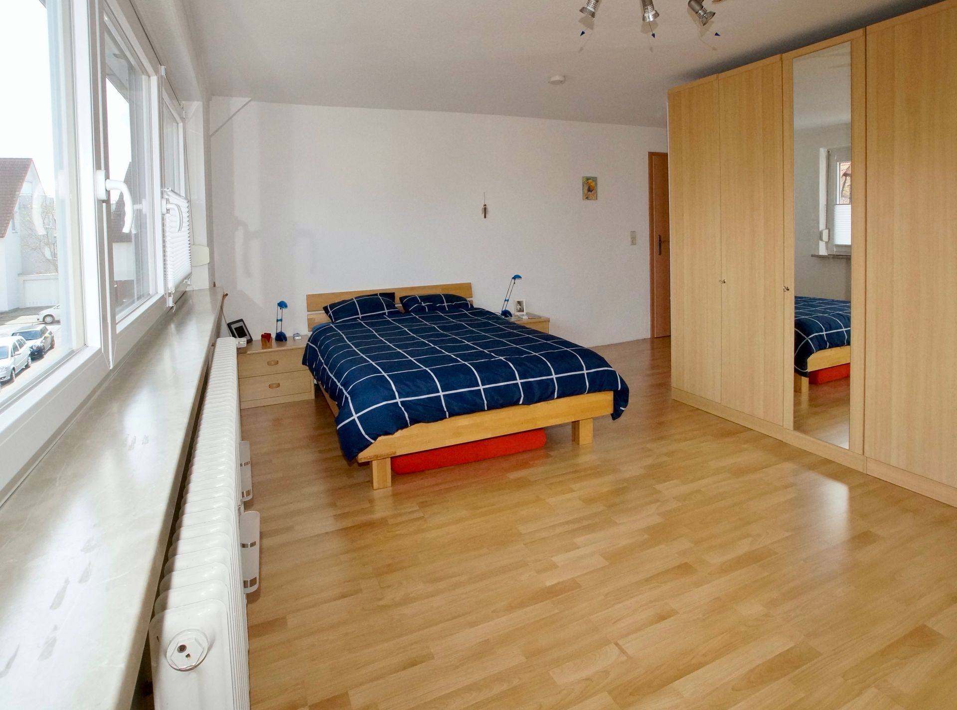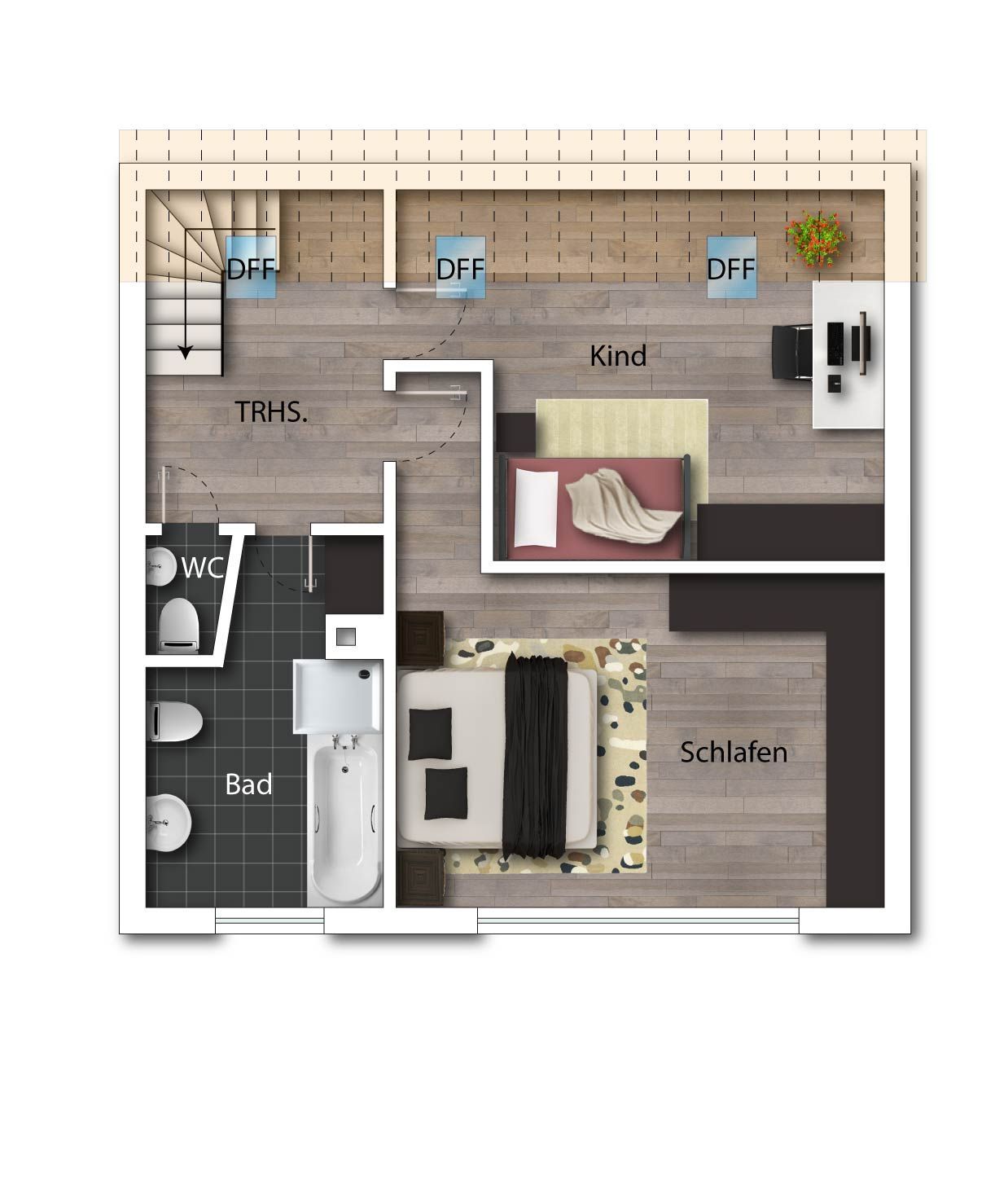 Im DG befinden sich ein großes Schlafzimmer, ein geräumiges Badezimmer mit Badewanne, Dusche, Waschbecken und WC, ein Gäste-WC und ein helles Kinderzimmer.