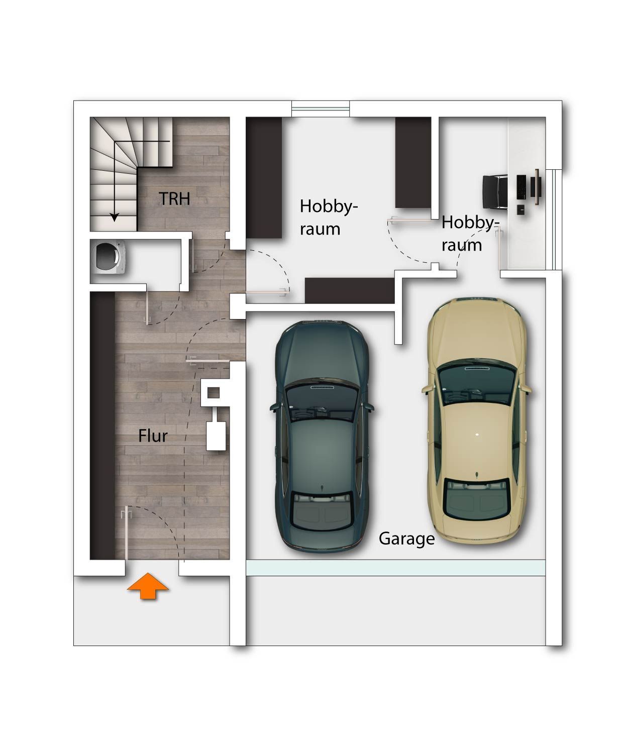 Hier sind neben dem Eingangsbereich die Doppelgarage und 2 beheizbare Hobbyräume untergebracht. Zum Werkeln, Basteln und Verstauen wird Ihnen genügend Fläche geboten. Auch die Waschmaschine und der Trockner finden auf dieser Etage in einem kleinen Raum ihren Stellplatz.