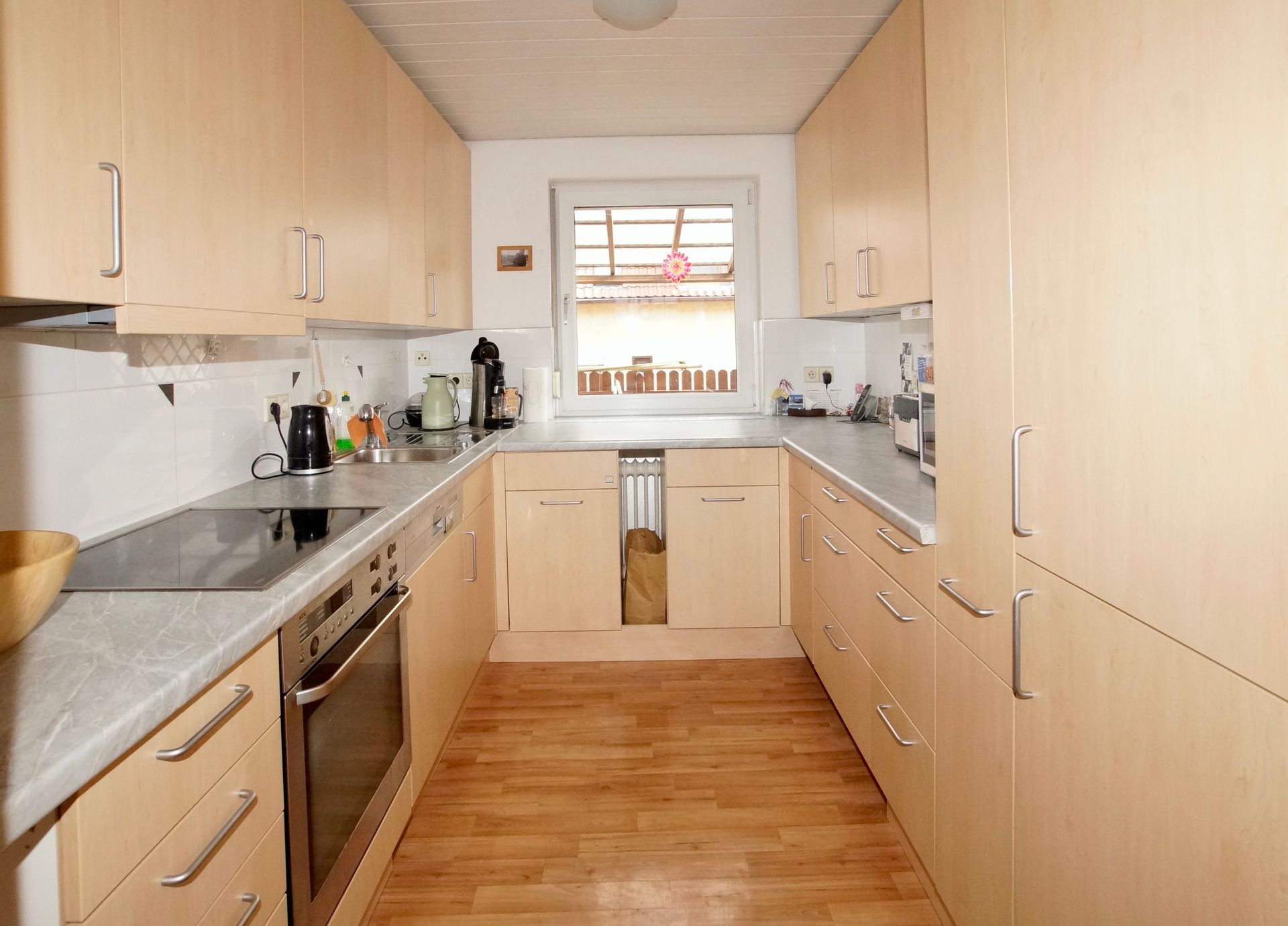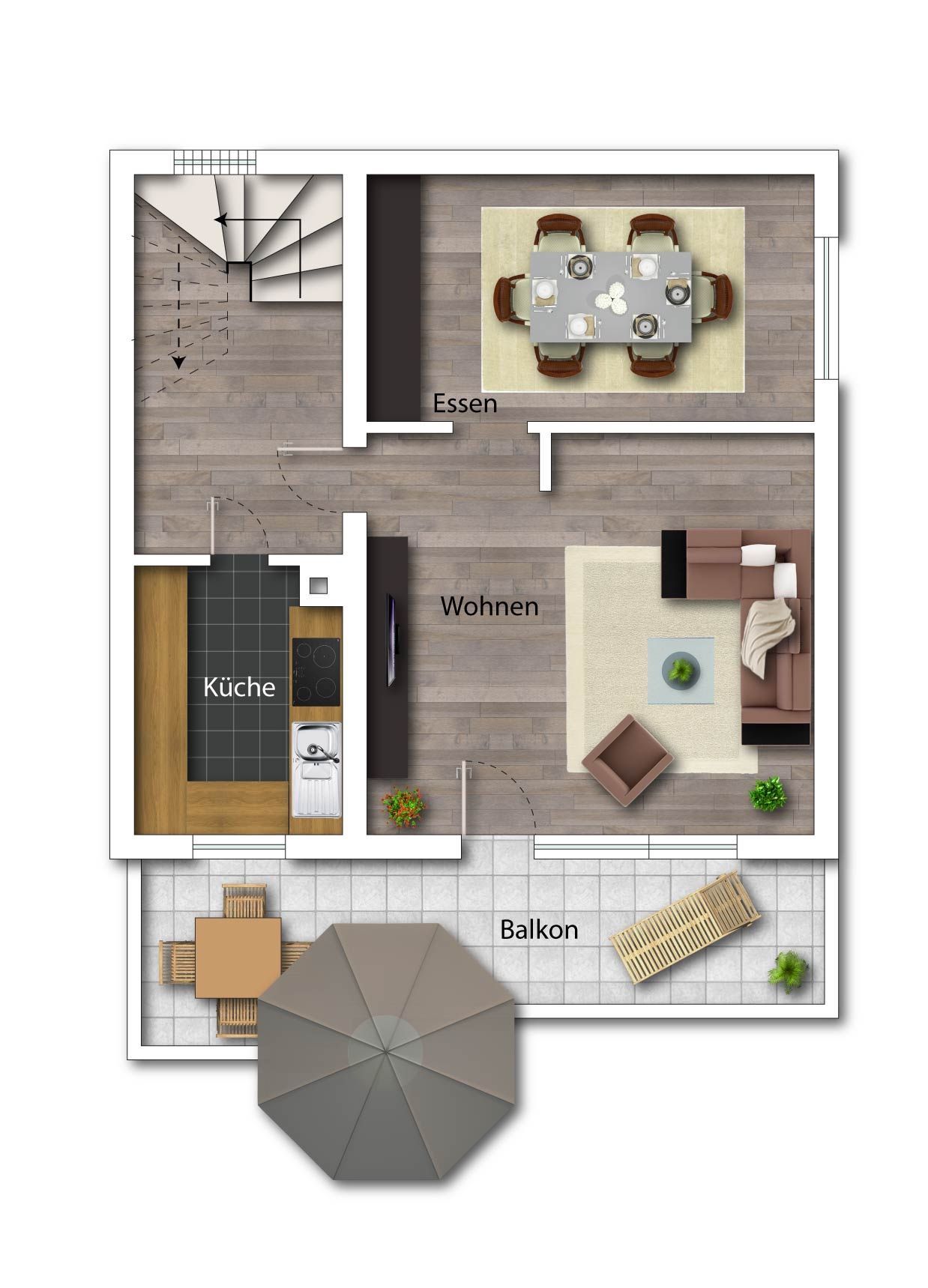 Auf dieser Ebene verteilen sich die Küche und der großzügige, helle Wohn-/Essbereich mit Balkon. Diese Räumlichkeiten bieten genügend Platz für gemütliche Treffen mit Freunden oder der Familie. Der teilüberdachte Balkon grenzt an den Wohnbereich und sorgt für erholsame Stunden im Freien.