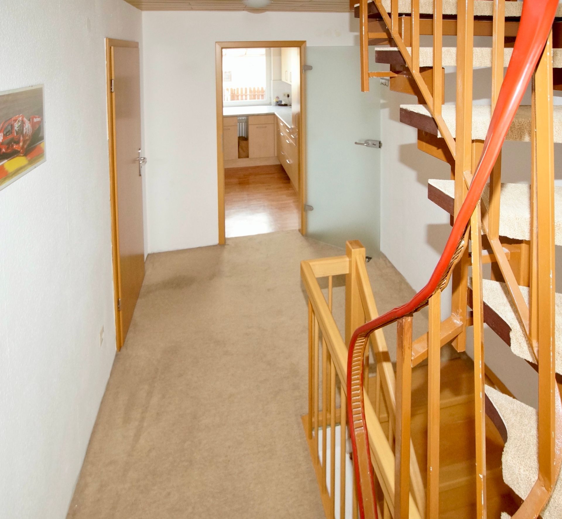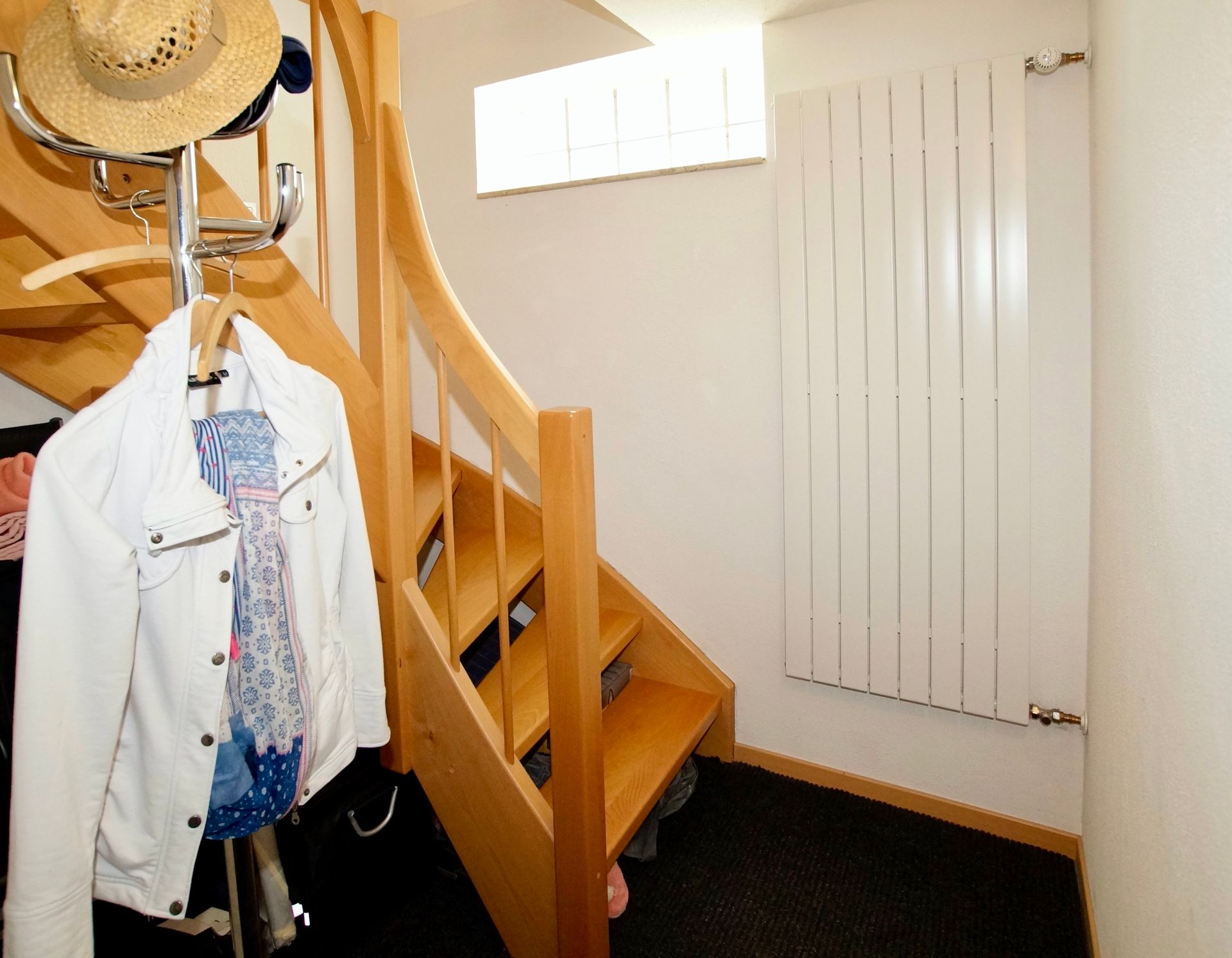 Das helle Treppenhaus mit seiner schönen Buchenholztreppe ist mit einer Glastür zum übrigen EG-Bereich abgetrennt und verhindert einen Wärmeverlust in den Wohnbereichen.