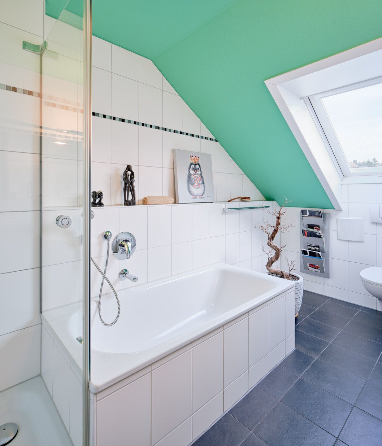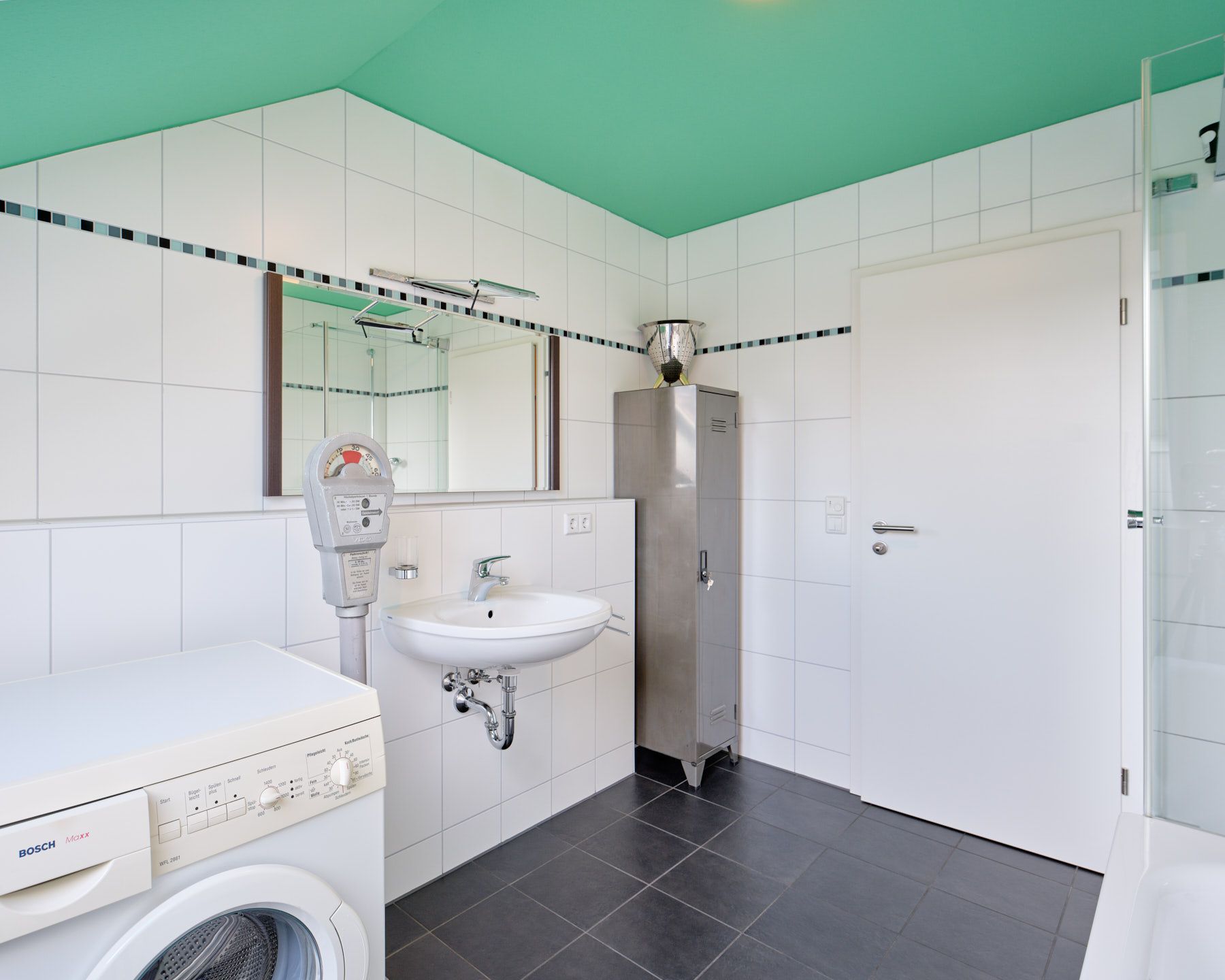 Weiteren Komfort stellt das geräumige Tageslicht-Bad zur Verfügung. Neben Waschbecken und WC finden ebenso Badewanne, Dusche, Waschmaschine und Trockner Platz.