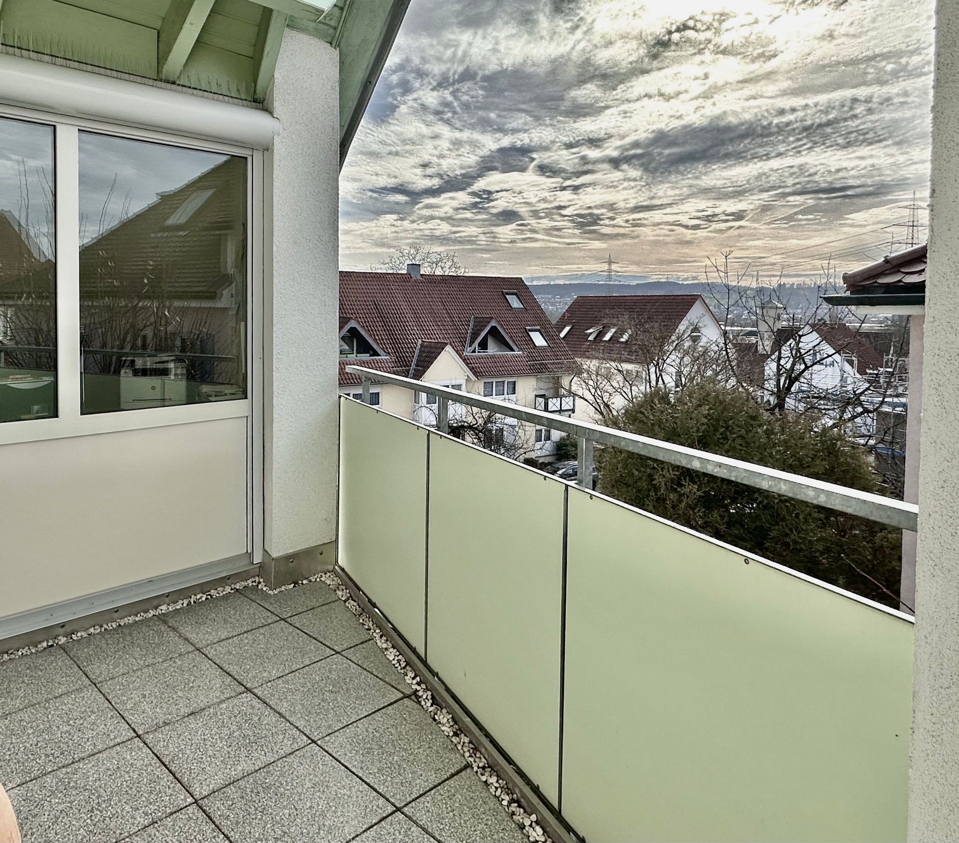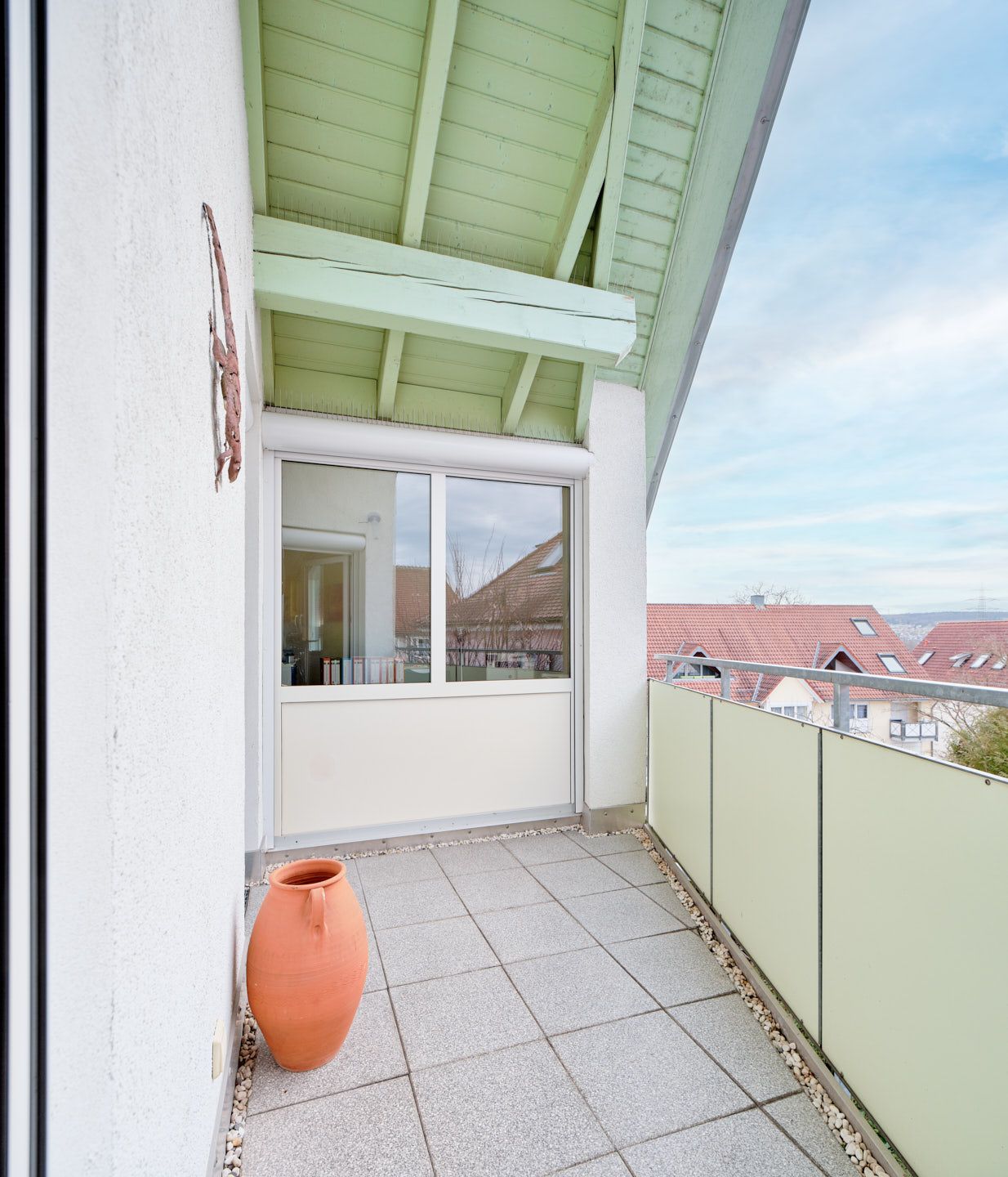An den Wohn-/Essbereich grenzt die Südloggia, die über 2 Zugänge vom Wohnzimmer aus erreichbar ist. Genießen Sie windgeschützt Ihr Frühstück im Freien und den östlichen Blick auf Altbach sowie Deizisau..
