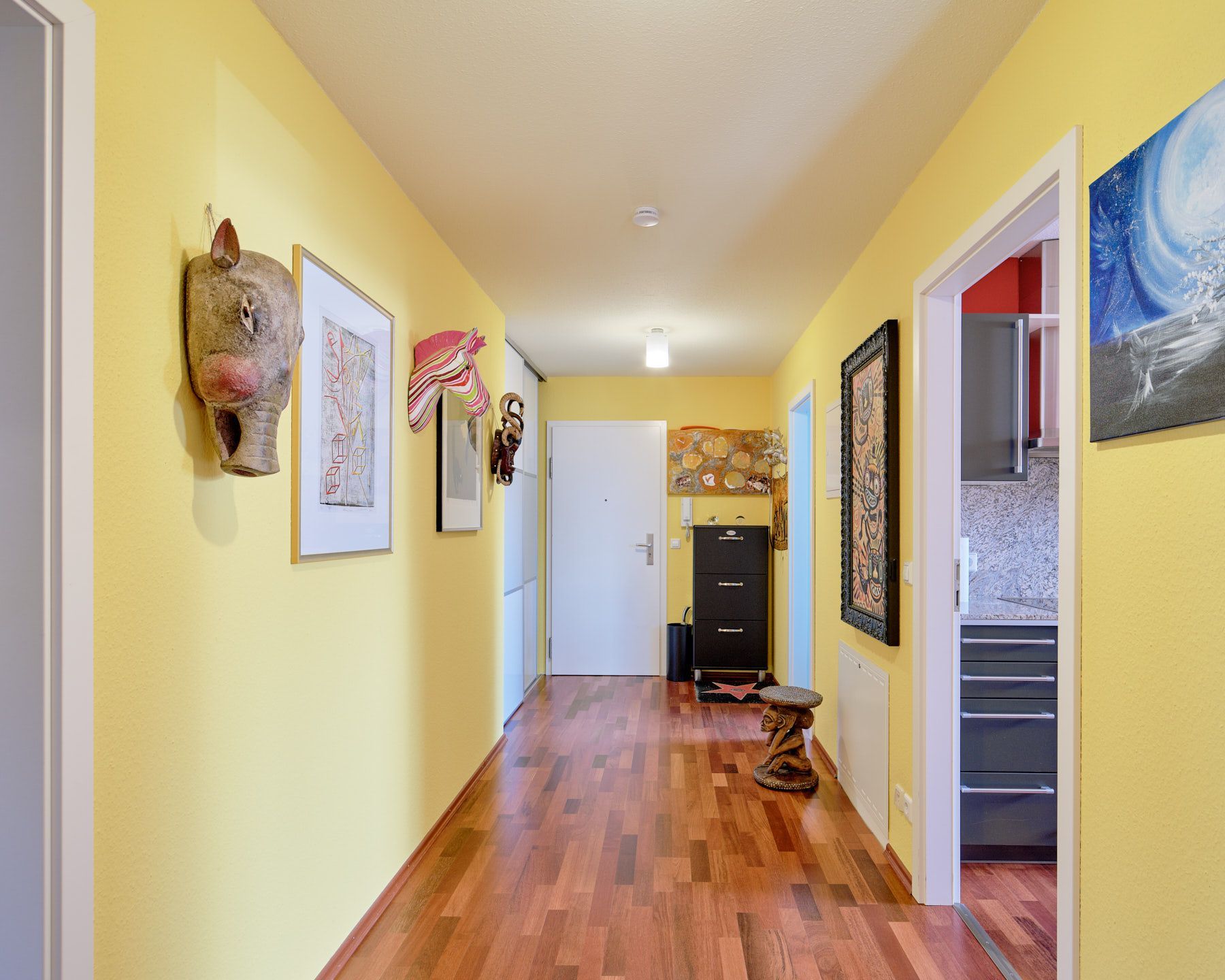 Die gelungene Aufteilung der Wohnfläche schafft großzügige Räume. Bereits der einladende Eingangsbereich hält viel Platz für den Empfang von Gästen, die Garderobe sowie zum Stellen weiterer Schränke bereit.
