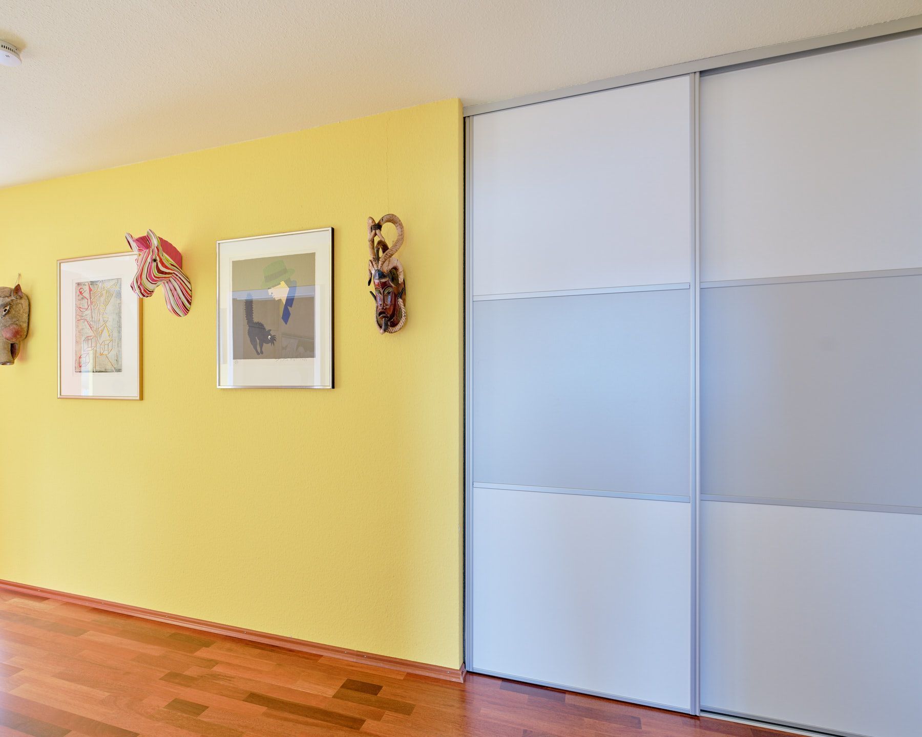 Raffiniert wurde in dieses Zimmer ein Arbeitsplatz integriert und anhand einer Trennwand kaschiert.