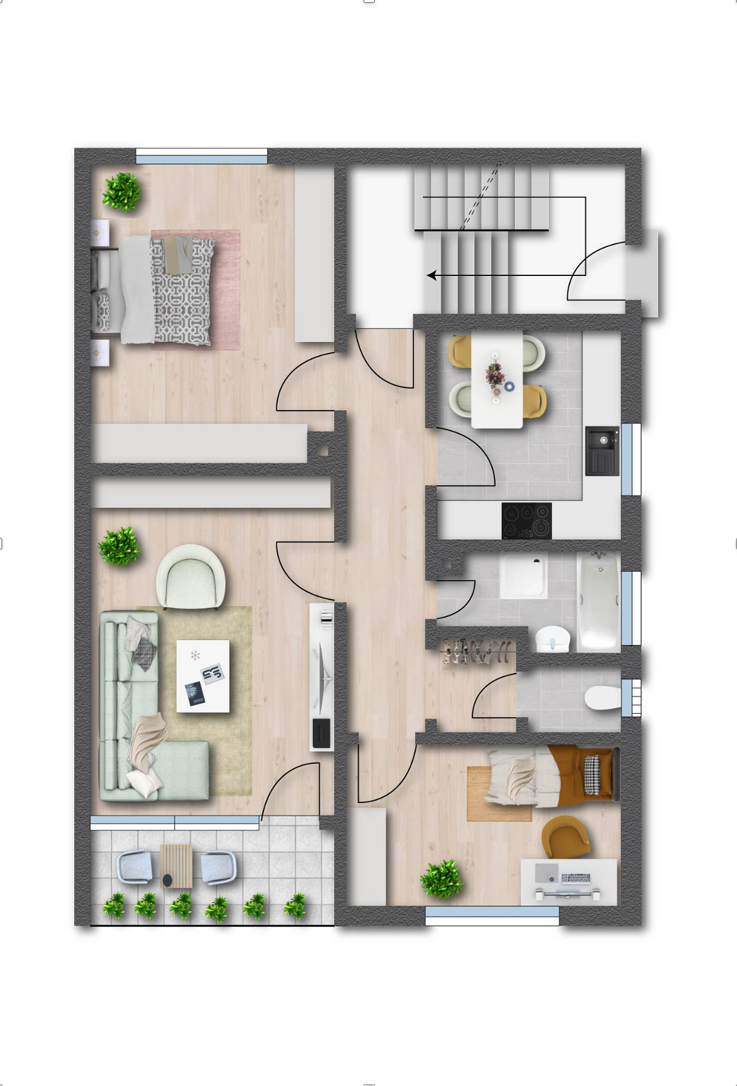 Zwei Etagen mit je einer Wohnung von ca. 71 m² sowie ein zusätzliches Zimmer und ein großer Hobbyraum im EG verleihen diesem Haus eine hohe Flexibilität und ermöglichen vielfältige Lebenskonzepte wie: