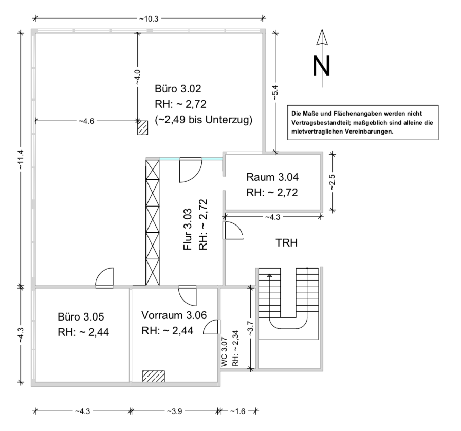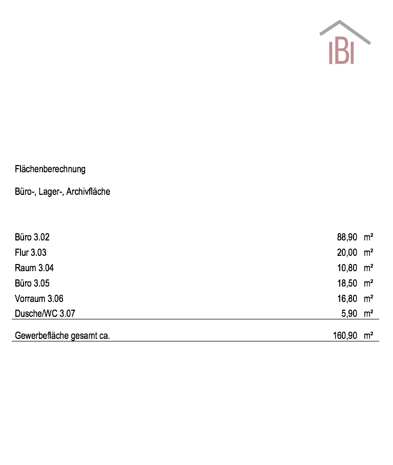 Auf ca. 160,9 m² verteilen sich ein großer L-förmig geschnittener Raum ca. 88,9 m², ein Eingangsbereich ca. 20,0 m², ein hell gefliestes WC mit Dusche ca. 5,9 m² und drei weitere Räume mit ca. 10,8 m², 16,8 m² und 18,5 m².