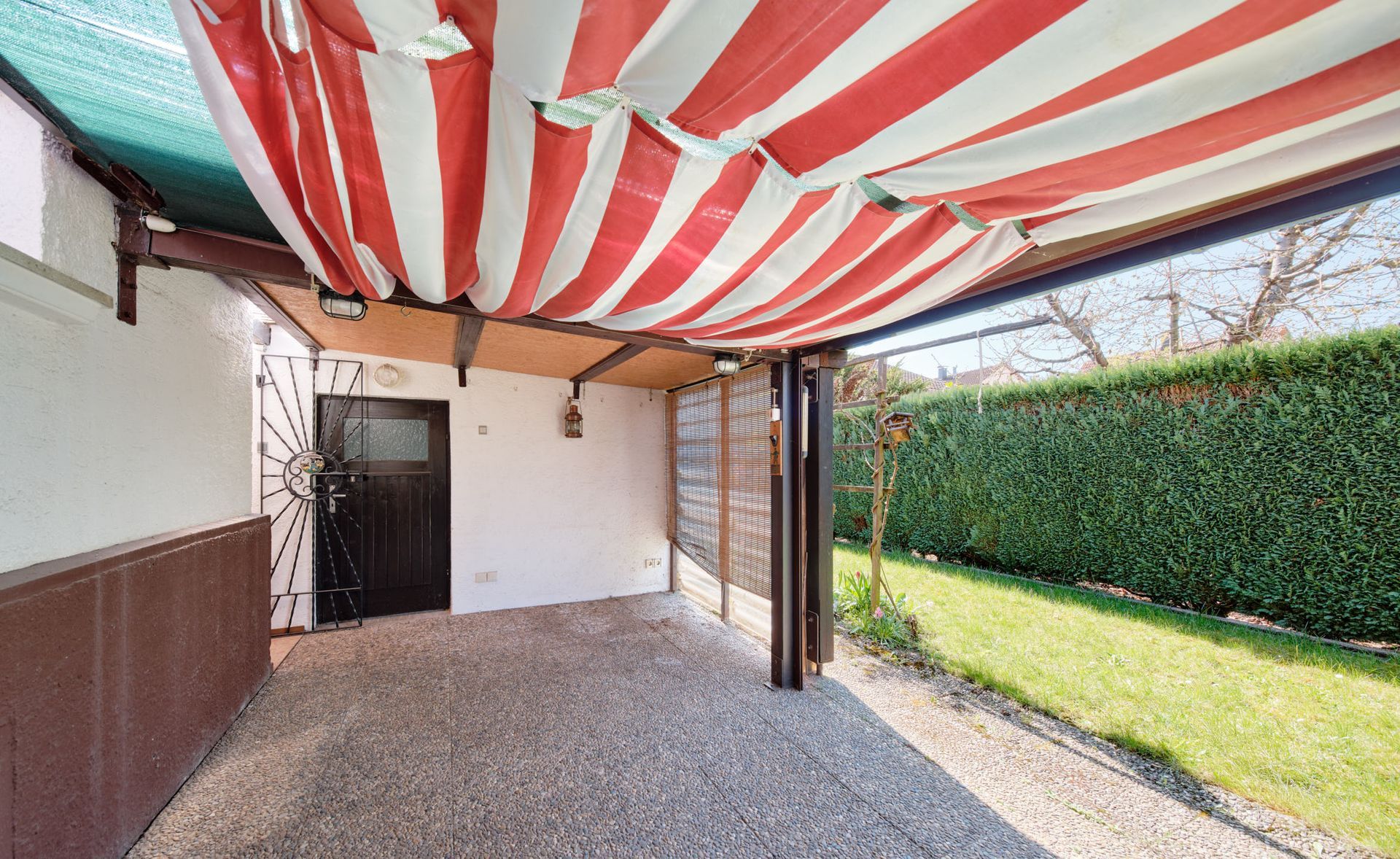 Garten mit West-Terrasse und elektrischem Rolltor zum Verschließen der Terrasse