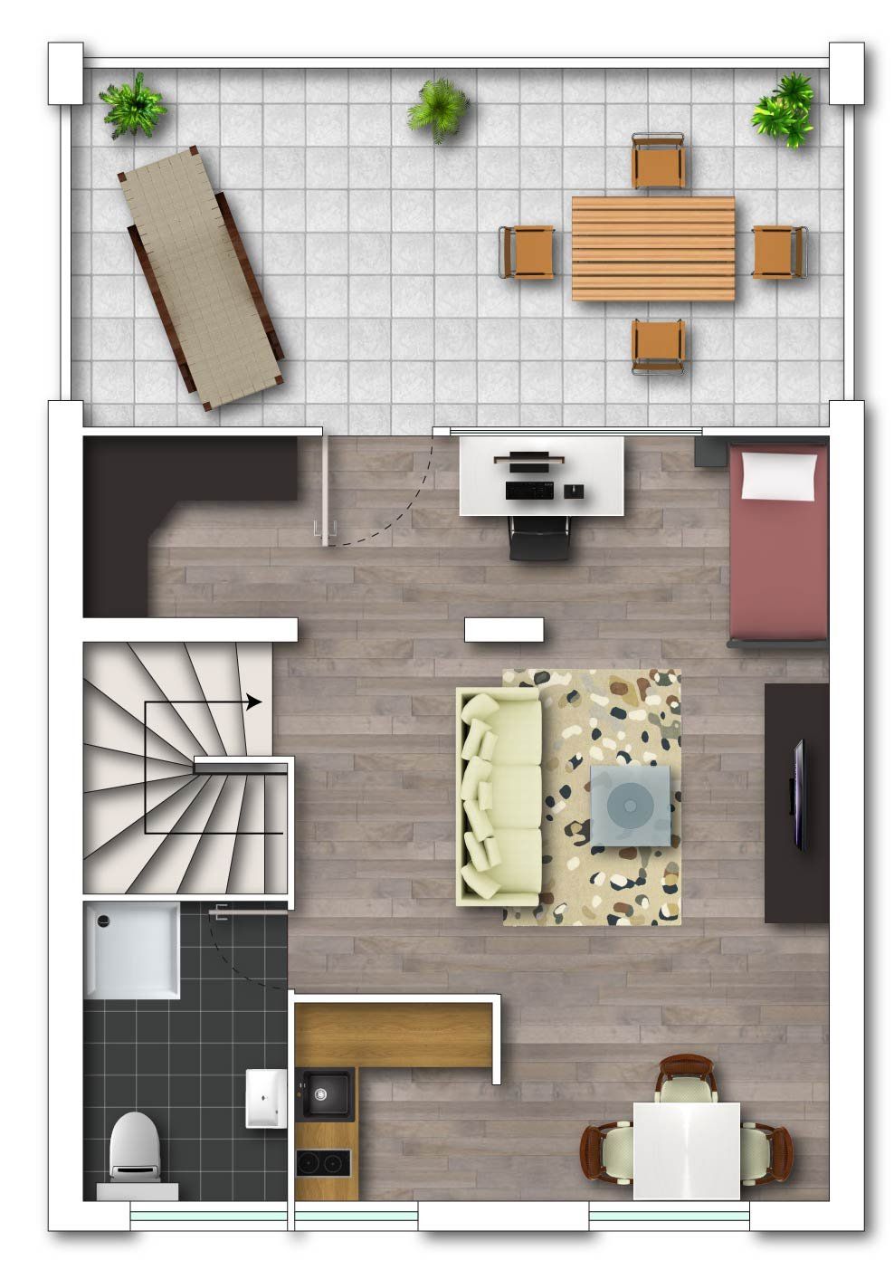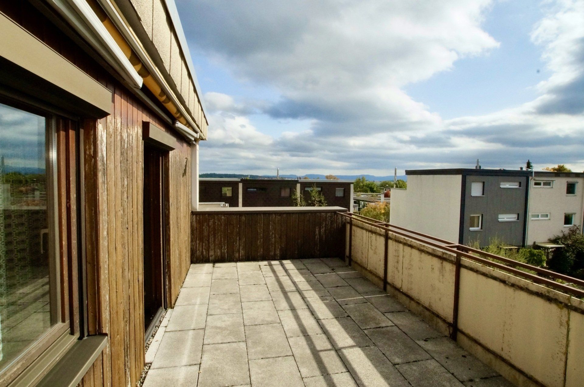 DG: Diese Ebene enthält ein vielseitig nutzbares Studio mit Kochnische, ein zweites Tageslicht-Bad mit Dusche, WC und Waschbecken sowie eine große Südwest-Dachterrasse, auf der bei schöner Fernsicht und viel Sonne herrlich vom Alltag abgeschaltet werden kann.