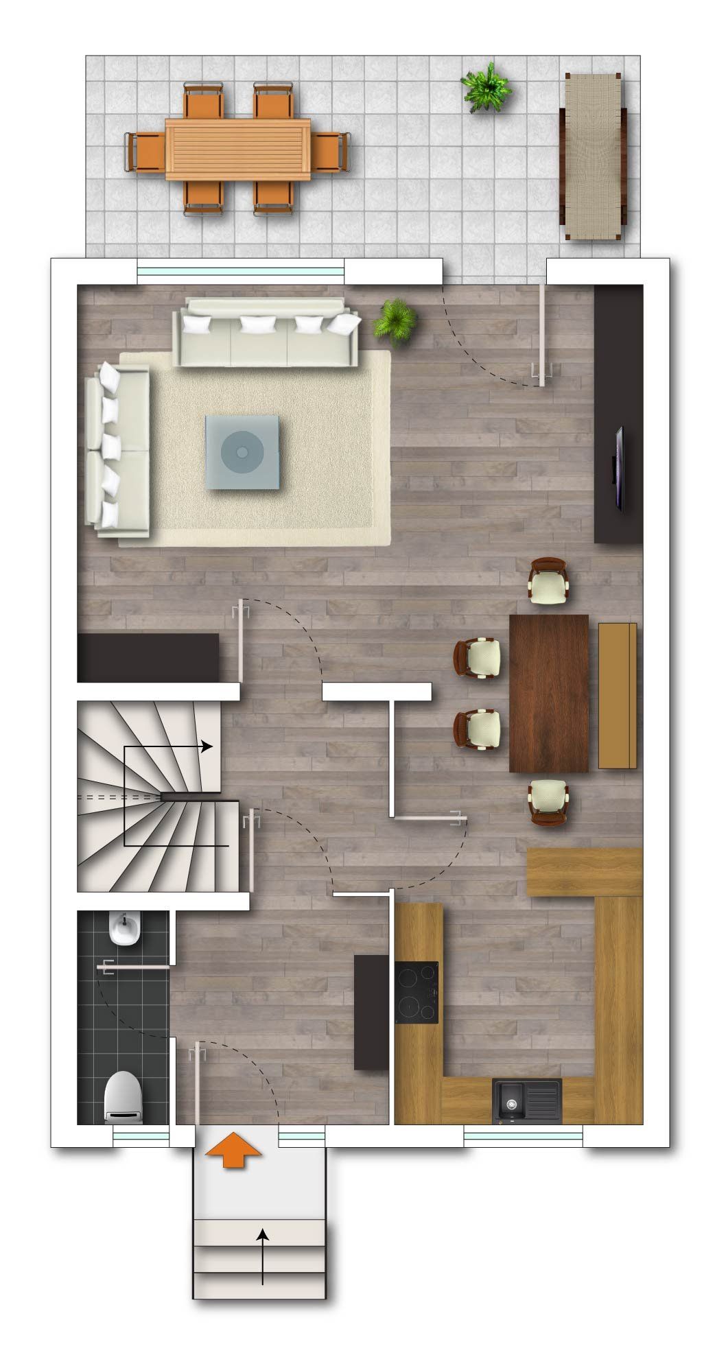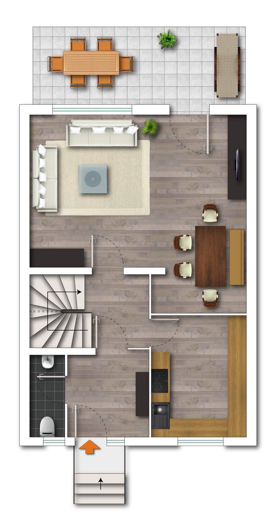 EG: Bereits der großzügige, einladende Eingangsbereich mit ausreichend Platz für die Garderobe zeigt den durchdacht geplanten Grundriss. Das Treppenhaus wurde vom Wohn-/Esszimmer und der Küche abgegrenzt platziert, wodurch in diesen Räumen Privatsphäre und in den oberen Etagen mehr Ruhe gewährleistet wird. Die geräumige Küche hält viel Arbeitsfläche bereit und ermöglicht gemeinsames Kochen und Backen mit Familie oder Freunden. Mittelpunkt des Hauses bildet das sonnenlichtverwöhnte Wohn-/Esszimmer mit Blick in den schönen, grün eingewachsenen Garten, der von hieraus ebenerdig über die Terrasse zugänglich ist. Perfekt nach Südwesten ausgerichtet, können Sie hier geschützt entspannen und auch nach Feierabend noch Sonnenstrahlen genießen.