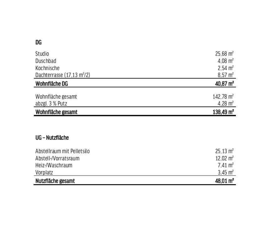 UG: Das Untergeschoss umfasst drei Räume. Ein Raum wird als Heizraum genutzt, der ebenfalls Stellfläche für die Waschmaschine bietet und über ein Waschbecken verfügt. In dem zweiten Raum ist das Pelletsilo untergebracht. Dieser Raum hält zusätzlich noch großzügigen Platz für weitere Nutzungsmöglichkeiten bereit. Der dritte Raum dient als Vorrats- und Abstellraum.