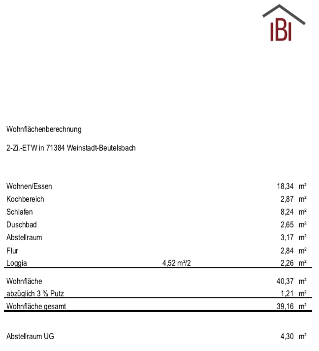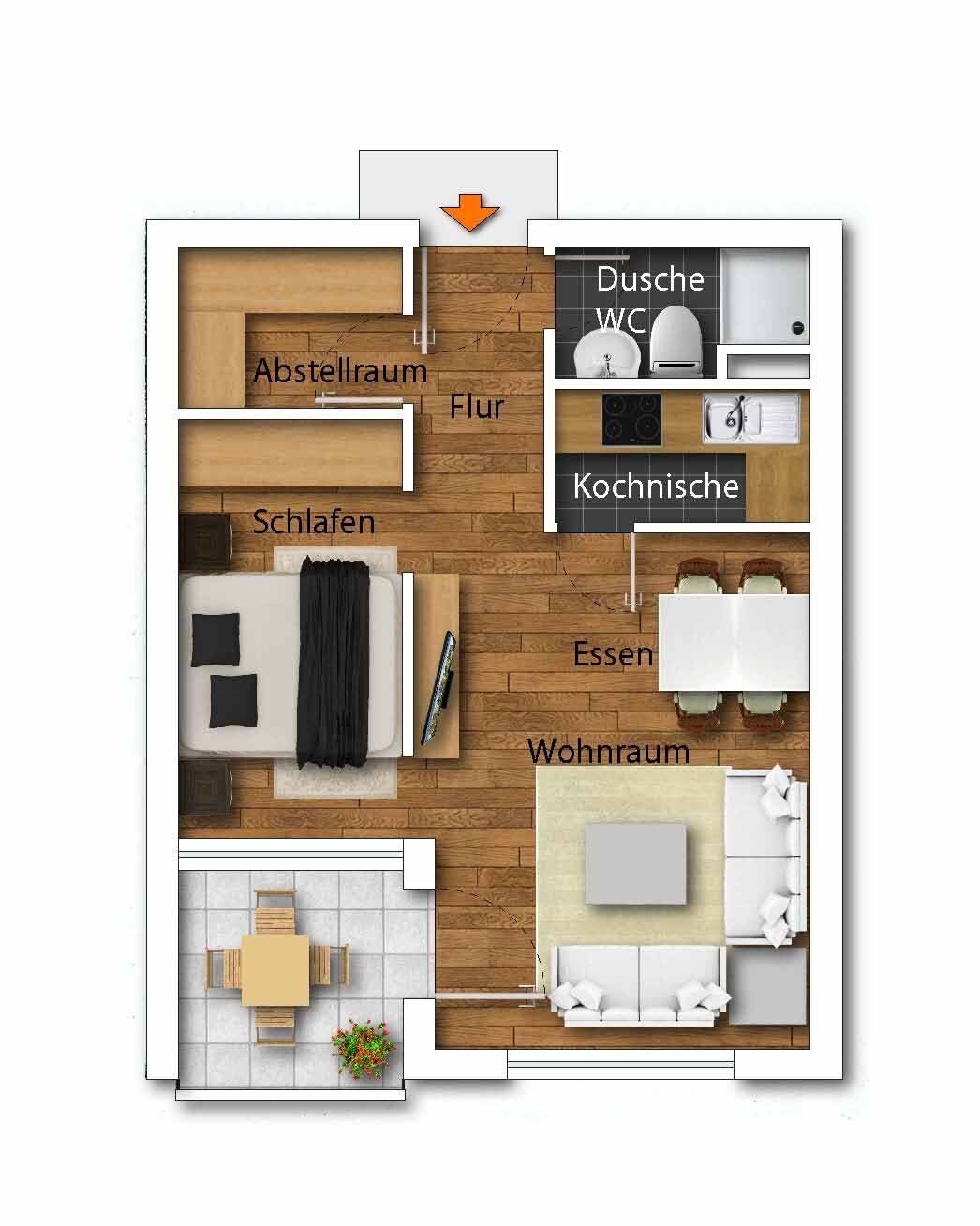 Die durchdachte Grundrissplanung sorgt auf ca. 39,16 m² Wohnfläche für viel Komfort. So verfügt das große, helle Wohn-/Esszimmer über genügend Stellfläche für eine Wohnlandschaft und einen Esstisch direkt neben dem praktisch abgeteilten Kochbereich. Weiterhin wurde der Grundriss so geschickt geplant, dass innerhalb der Wohnung ein Abstellraum großzügige Staufläche bereithält und auch im Schlafzimmer ein Doppelbett sowie ein Schrank mit 2 m Länge ausreichend Platz finden.