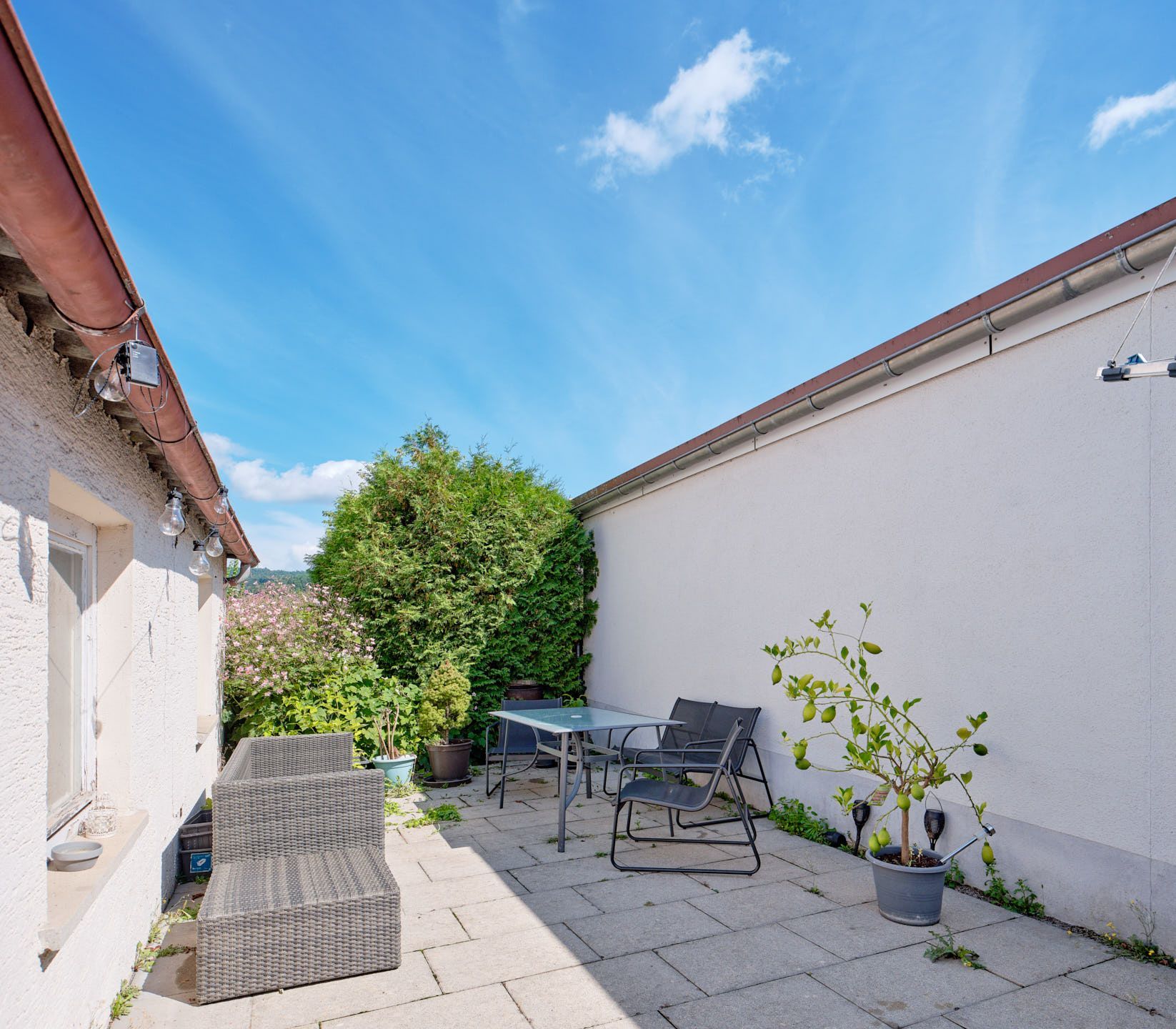Für den erholsamen Aufenthalt im Freien steht eine schöne und geschützt liegende Gemeinschaftsterrasse zur Verfügung.