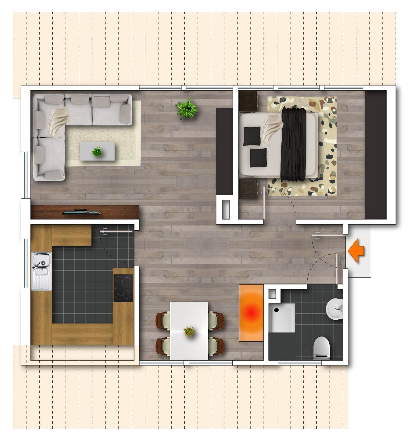 Ebenso verfügt die Küche über eine praktische Größe. Geschickt geplant, findet eine EBK mit viel Arbeitsfläche und ausreichendem Stauraum Platz, in der sich auch Hobbyköche verwirklichen können. Das Tageslicht-Duschbad beinhaltet eine Dusche, ein Waschbecken und ein WC.