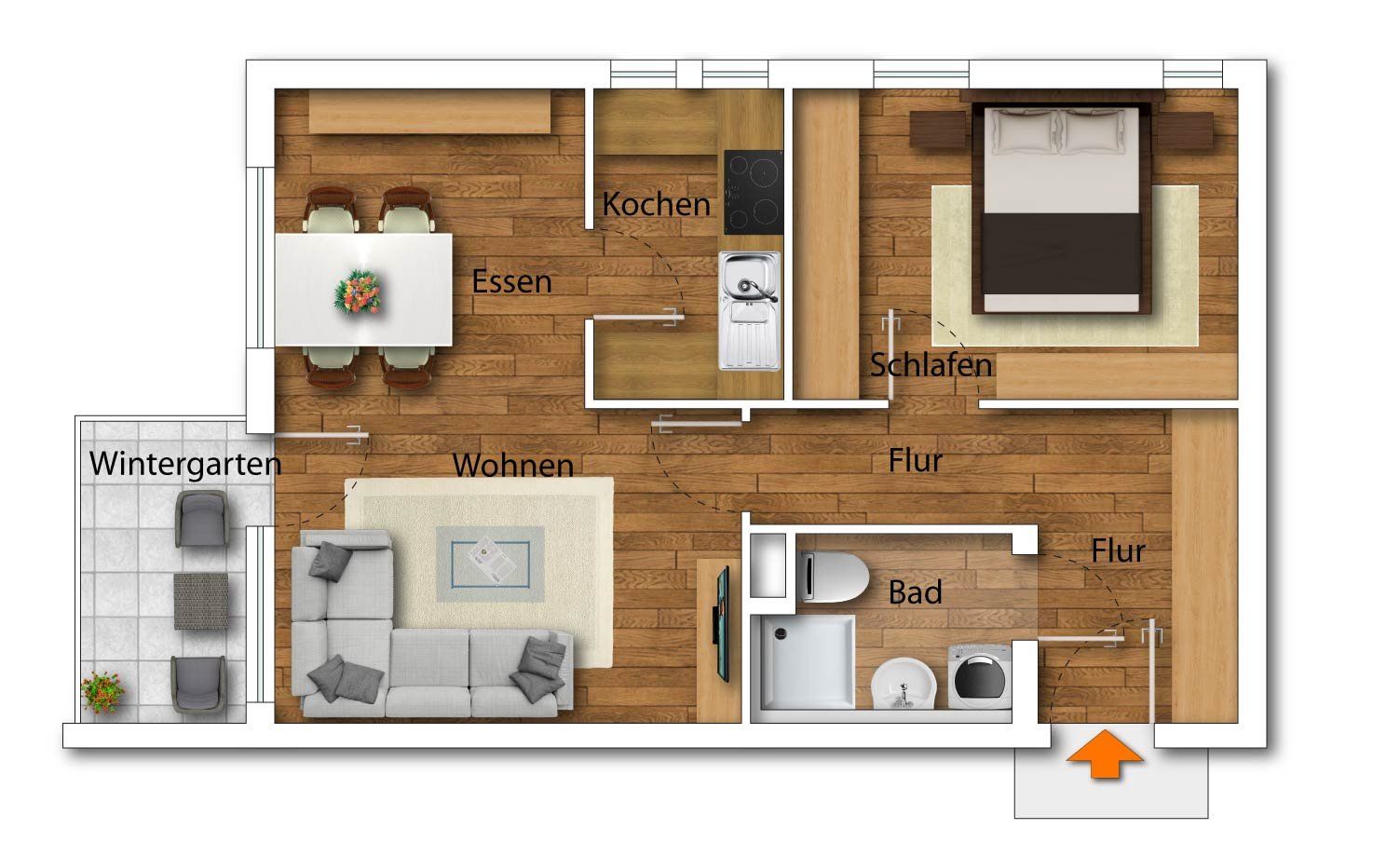 Der durchdachte Grundriss sorgt für einen großzügigen, hellen Wohn-/Essbereich, in dem auch Besuch genügend Platz findet. An das Wohnzimmer grenzt ein kleiner, westlich ausgerichteter Wintergarten, der auch an kühleren Tagen oder bei Regen das Gefühl, sich im Freien aufzuhalten, vermittelt.