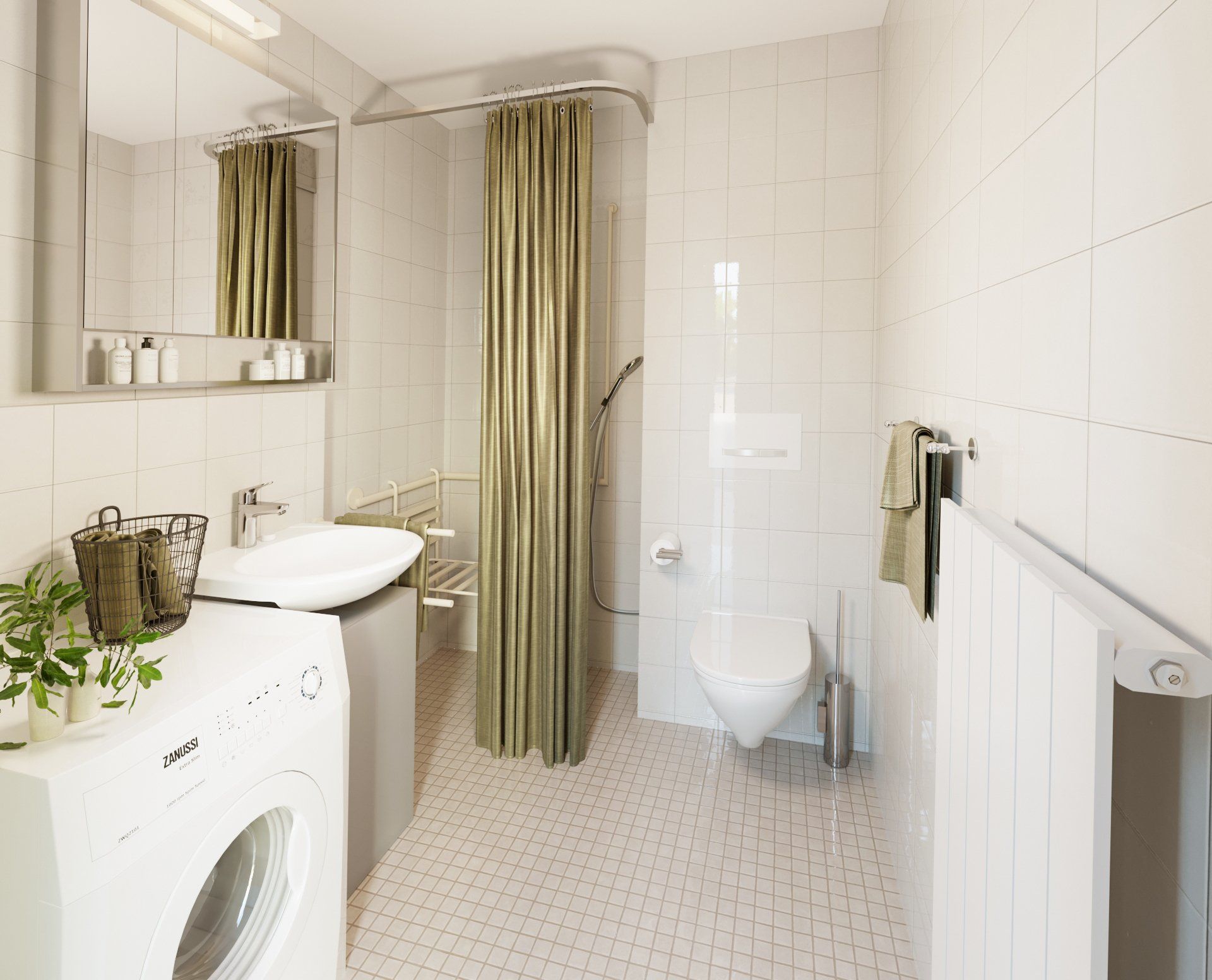 Die Küche ist mit einer zeitlosen weißen EBK ausgestattet. Wer gerne kocht oder bäckt, kommt hier nicht zu kurz. Auch im Schlafzimmer und Flur wird die gute Grundrissplanung deutlich, denn in beiden Räumlichkeiten ist ausreichend Stellfläche für große Schänke. Das hell geflieste Bad ist so konzipiert, dass die Waschmaschine untergebracht werden kann und dennoch genügend Bewegungsfreiheit für die Körperpflege vorhanden ist.