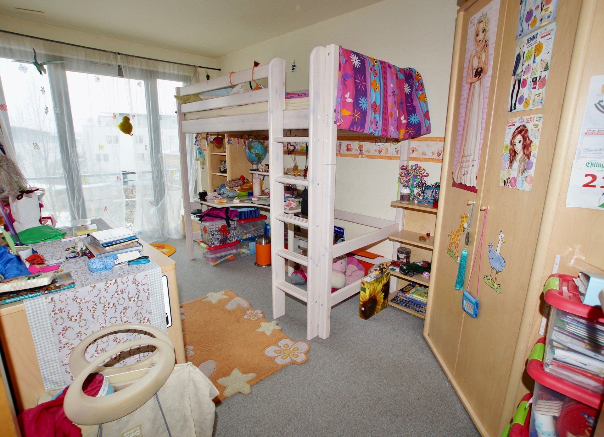 Die Aufteilung der Wohnfläche präsentiert sich hier einmal anders. So liegen der Wohnungseingang, der bequem mit dem Aufzug zu erreichen ist, das Gäste-WC, die Küche und das Wohnzimmer im Dachgeschoss. Darunter sind im 2. Obergeschoss 2 Kinderzimmer, das Bad mit Badewanne, Dusche, 2 Waschbecken und Waschmaschinenanschluss, ein separates WC und das geräumige Schlafzimmer angeordnet.