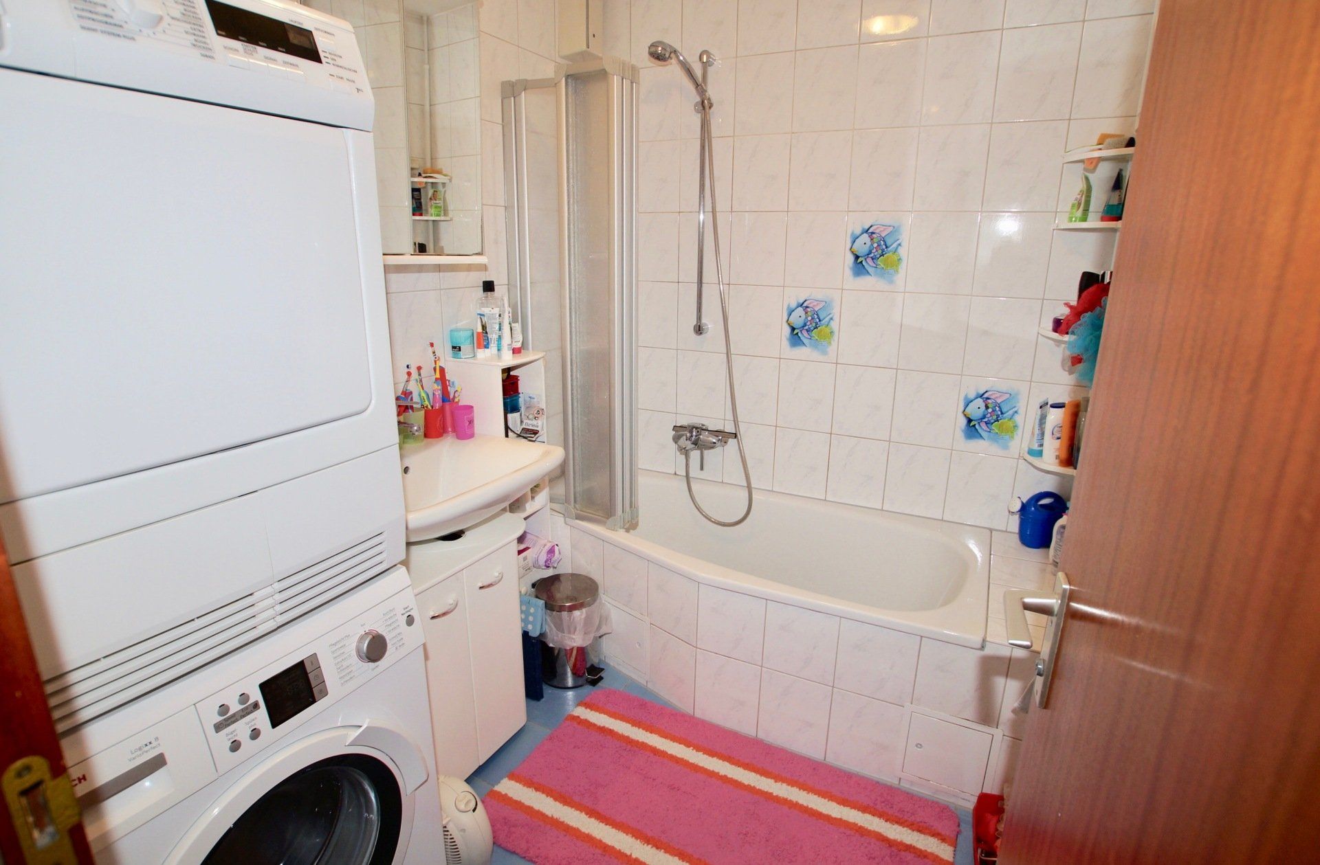 Das Bad mit Badewanne, Waschbecken und Waschmaschinenanschluss und das separate WC sind zeitlos hell gefliest.