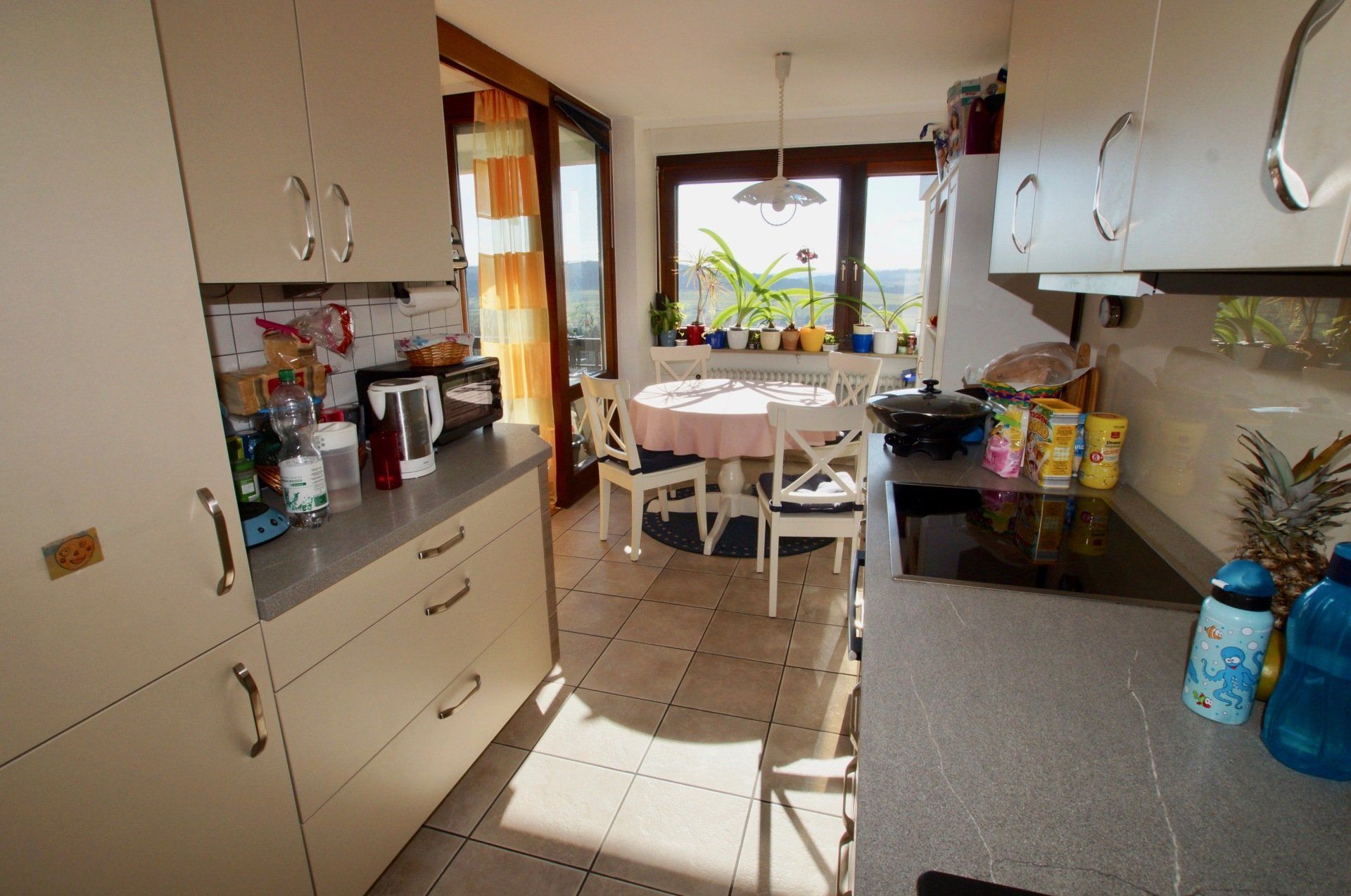 Die zentral gelegene Küche mit gemütlichem Essbereich ist vom Flur und Wohnzimmer aus zugänglich. Durch eine praktische Schiebetür kann diese aber auch zum Wohnbereich geschlossen werden. 2014 wurde eine neue EBK mit viel Stauraum für ein entspanntes Kochen eingebaut.